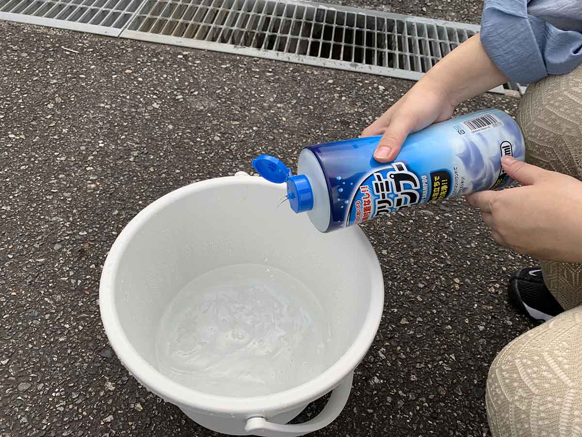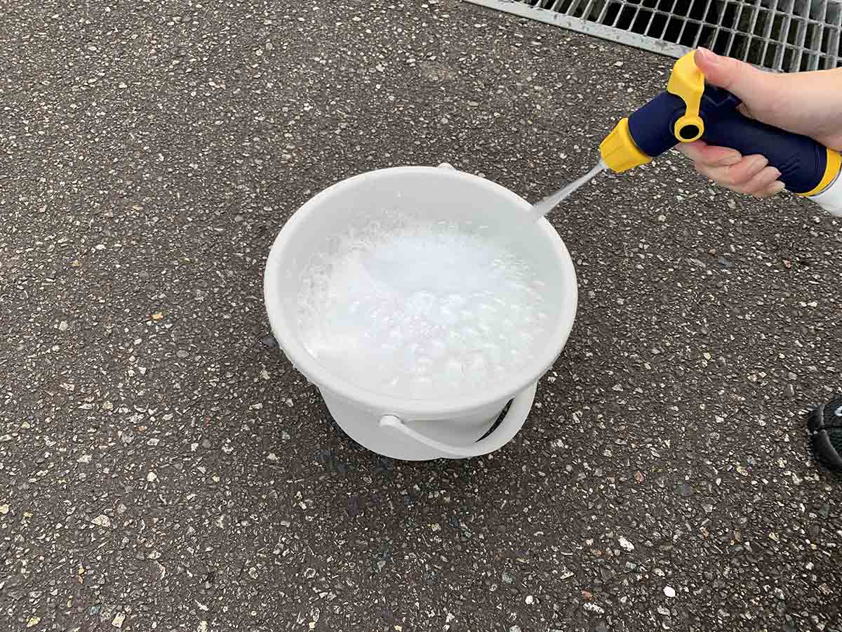 次に『すすぎが速い クリーミーシャンプー』をバケツに入れて、『Gジェッター』で勢いよく注いで泡立てていきます。