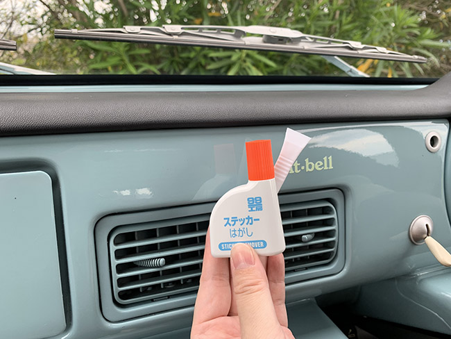 パオはアウトドアに映える車ということもあり、前のオーナーさんが貼っていたステッカーが一部剥がれて残っている状態でしたので、『ステッカーはがし』というアイテムを使って除去していきます。