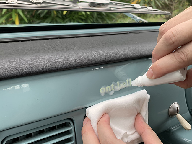 まずははがし液をステッカーの表面に塗っていきます。車内に垂れないように布などで液ダレを防げるようにしつつ、少しずつ液を出して表面にたっぷり塗っていきます。