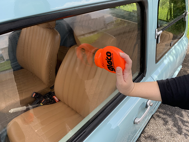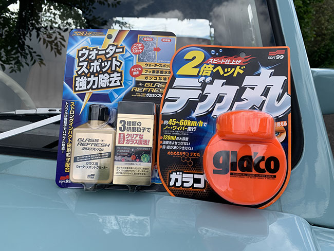 今回はガラスのクリーニングとガラス撥水剤「ガラコ」を塗りました。