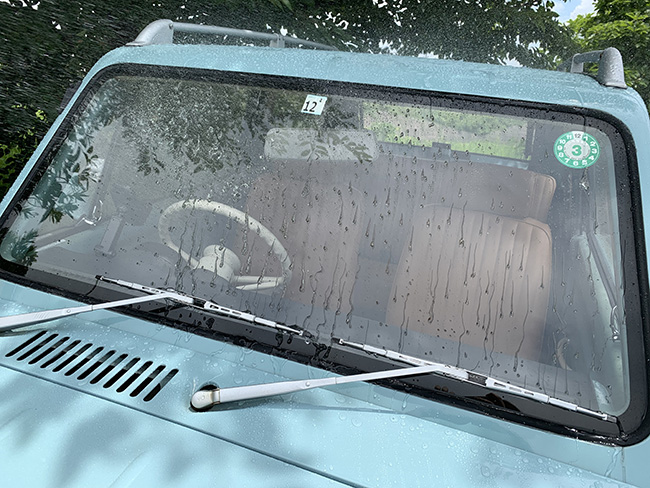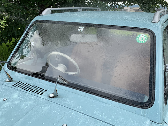 フロントガラスに施工しておけば、時速約45キロで走行時の風圧で水玉がぶわっとはじけ飛んでいくんです。