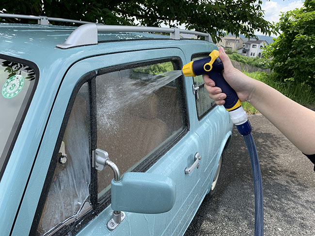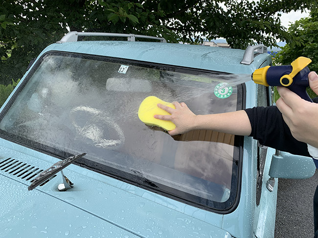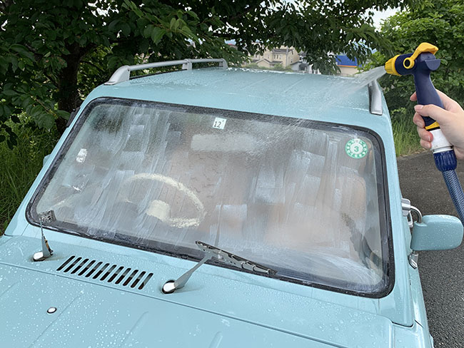 ガラス用のコンパウンドで磨く前に、まずはカーシャンプーで洗って軽く汚れを落とすのがお約束です。