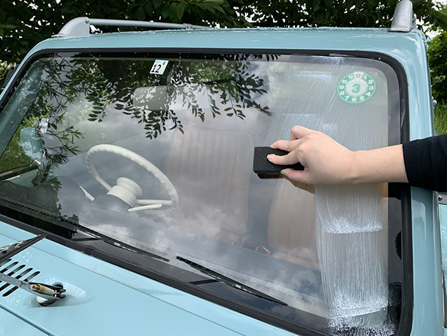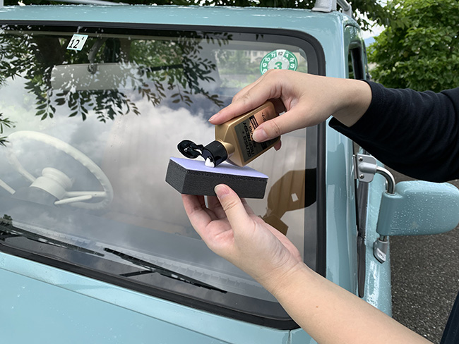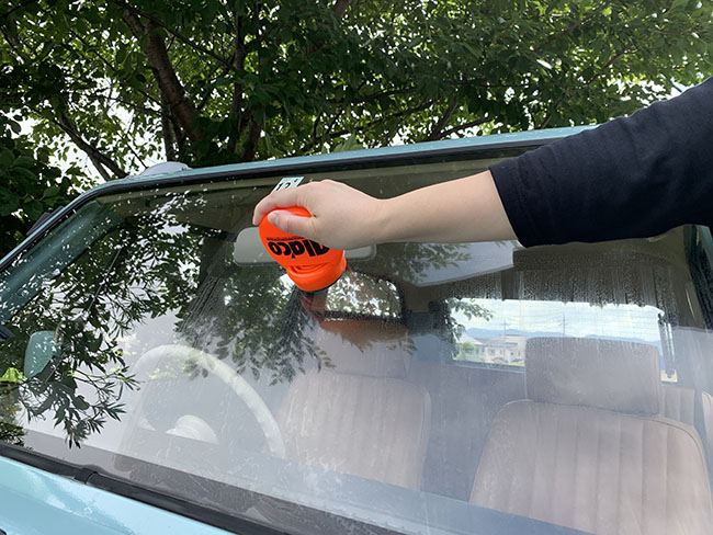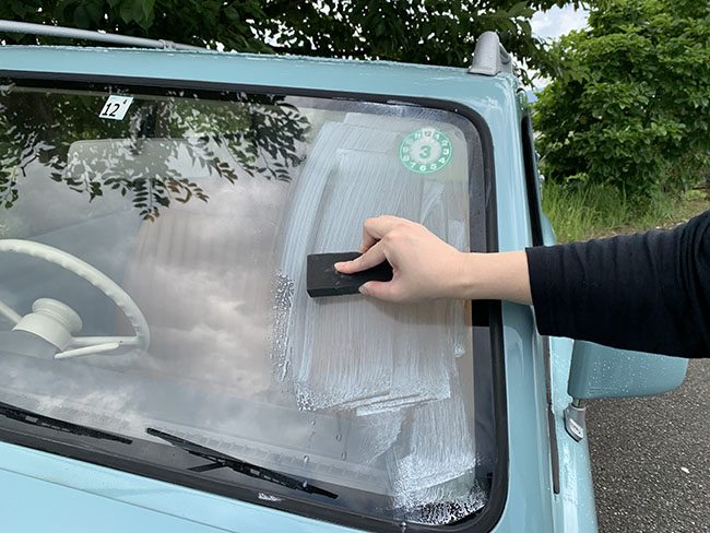 フロントガラスに隙間なく塗り込んで、約5分~10分乾かします。