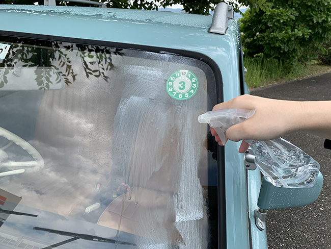 磨いているとだんだんとクリーナー液が乾いてきます。そうするとガラスが磨きづらくなってしまうのですが、そんなときは霧吹きなどを使い、少し水分を与えてあげるのと作業がしやすくなります。