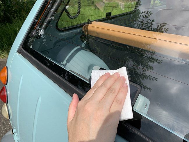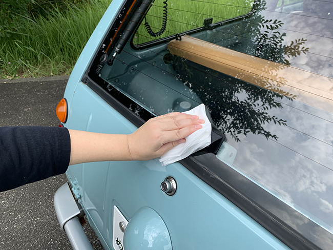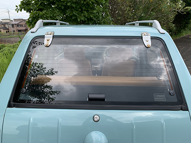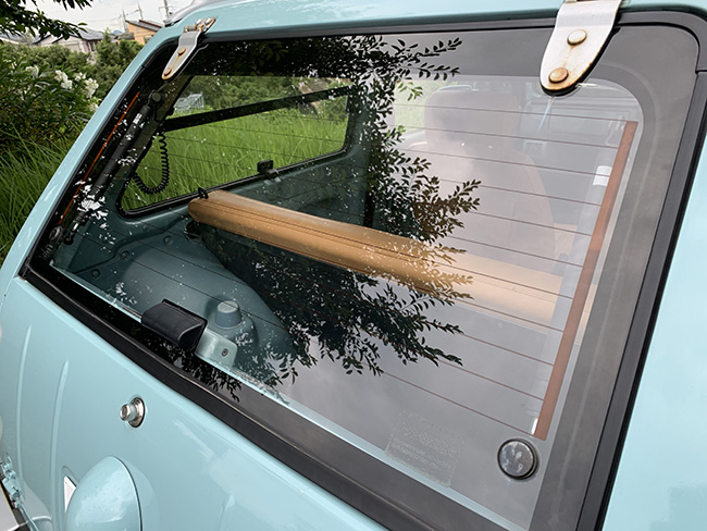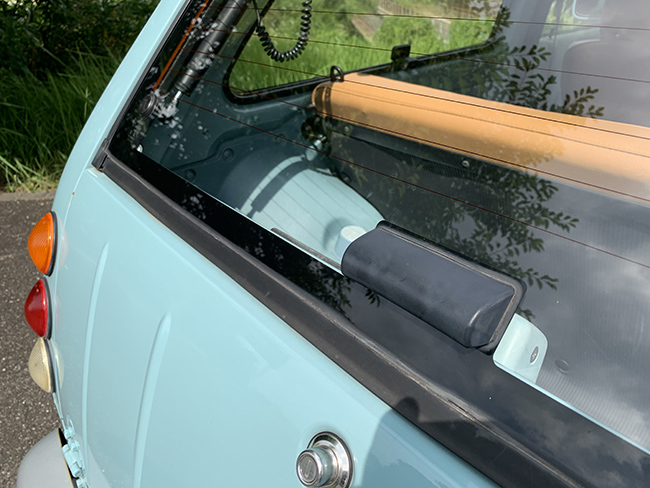 リア部分には全面開放できるウインドウがついているなど、とてもおしゃれで印象的なパオ。その分、ブラックパーツは多いイメージ。特に劣化が気になった部分は、まずリアのウインドウ周り。