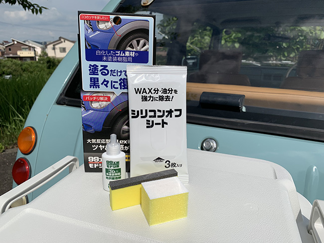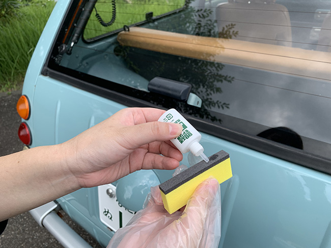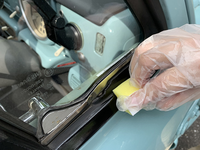 今度は、周囲のゴムパーツを作業していきます。先ほどと同様、「シリコンオフシート」で脱脂をした後に、今度は四角い形状のスポンジ(軟質樹脂用スポンジ)を使ってコート剤を塗り込んでいきます。