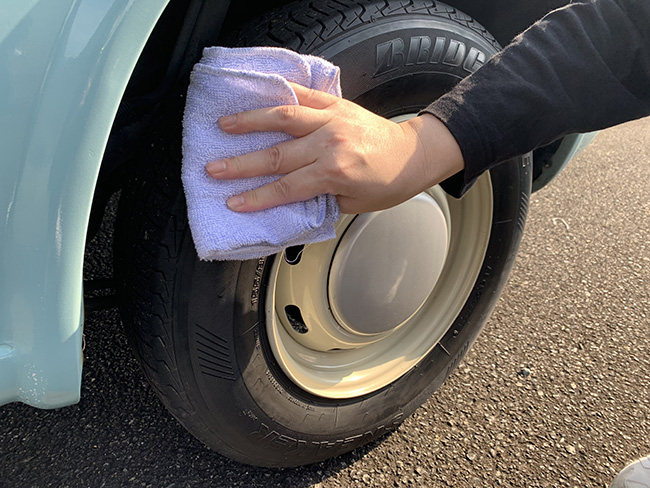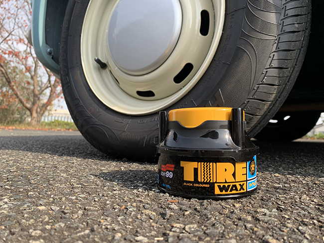 最後は、足元をタイヤワックスでキレイにして仕上げます。