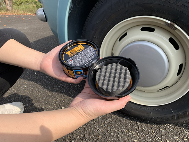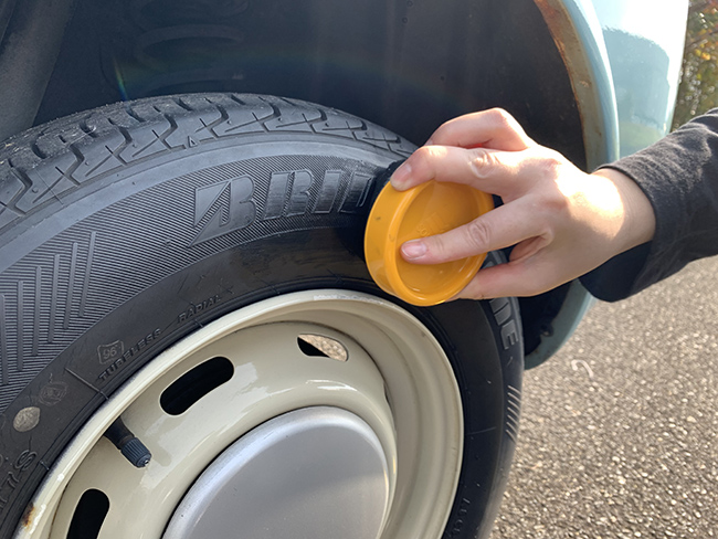 あとは、スポンジにワックスをとってこんな風にタイヤの表面に薄く、満遍なく塗っていきます。