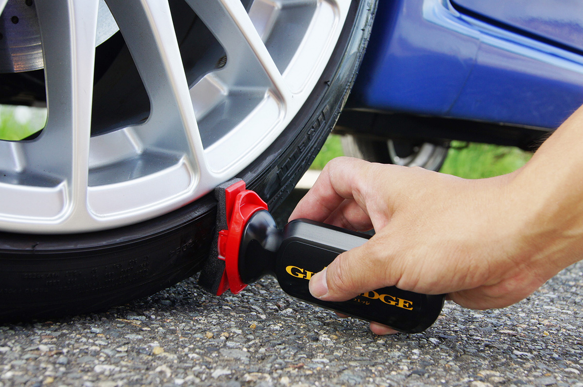 FLEXヘッドがタイヤの形状にぴったりとフィット、低偏平タイヤにも柔軟に追従します。タイヤとホイールの隙間もしっかりと塗ることでき、タイヤに沿うように塗り込むだけで濃厚なギラ艶に仕上がっていきます。