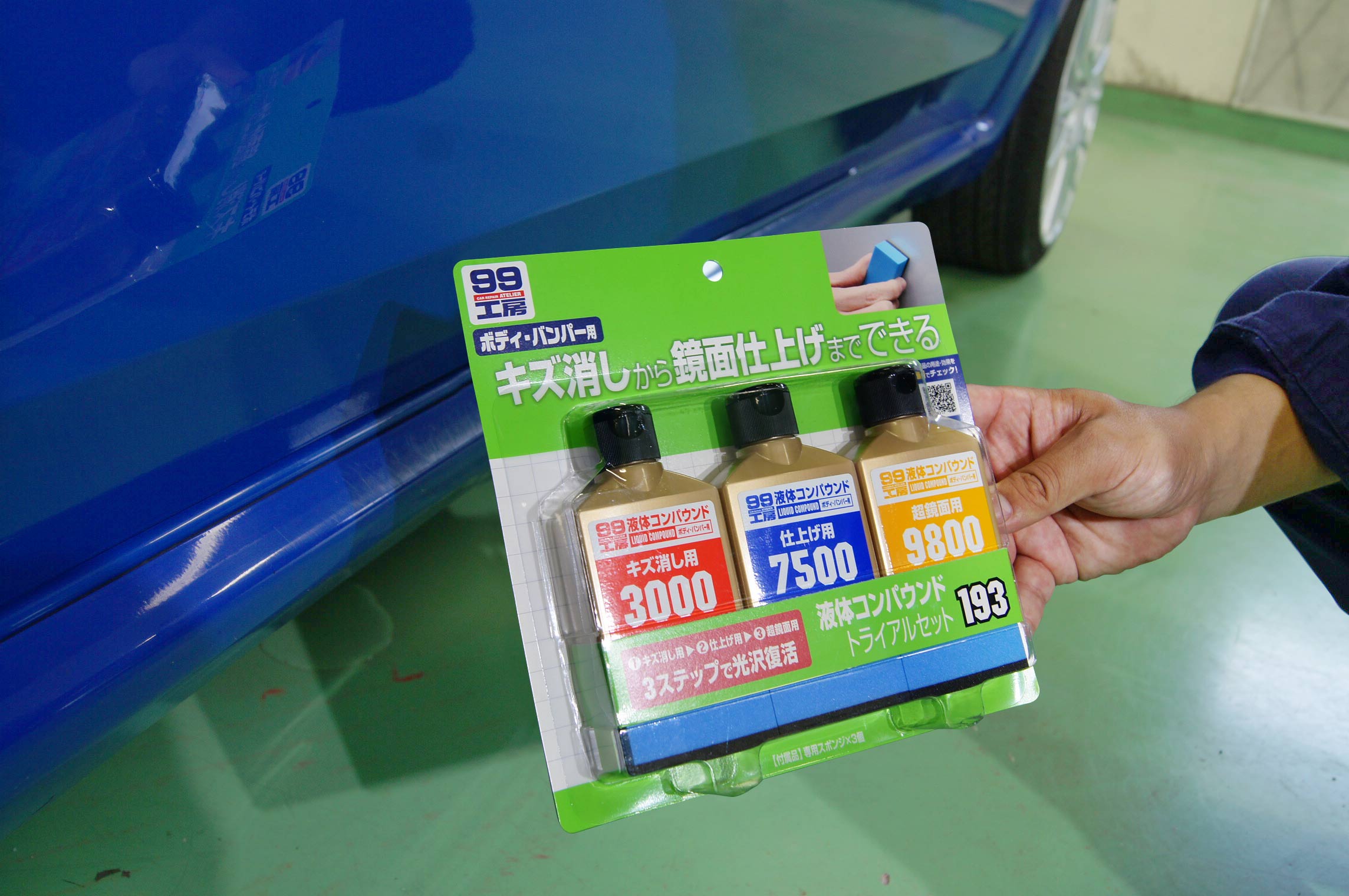 キズ消しから鏡面仕上げまでをワンセットで使用できるトライアルセット、『液体コンパウンドトライアルセット』です!研磨材の粗さである番手が異なる3000番の「キズ消し用」、7500番の「仕上げ用」、9800番の「超鏡面用」の3種類がセットになっています。3000番の「キズ消し用」から順にキズ面を磨いていく事で、キズを消しながら、コンパウンドによる磨き跡も消し、最終的にキレイに仕上げることができるのです。