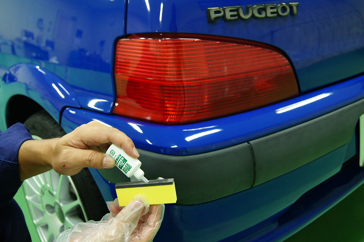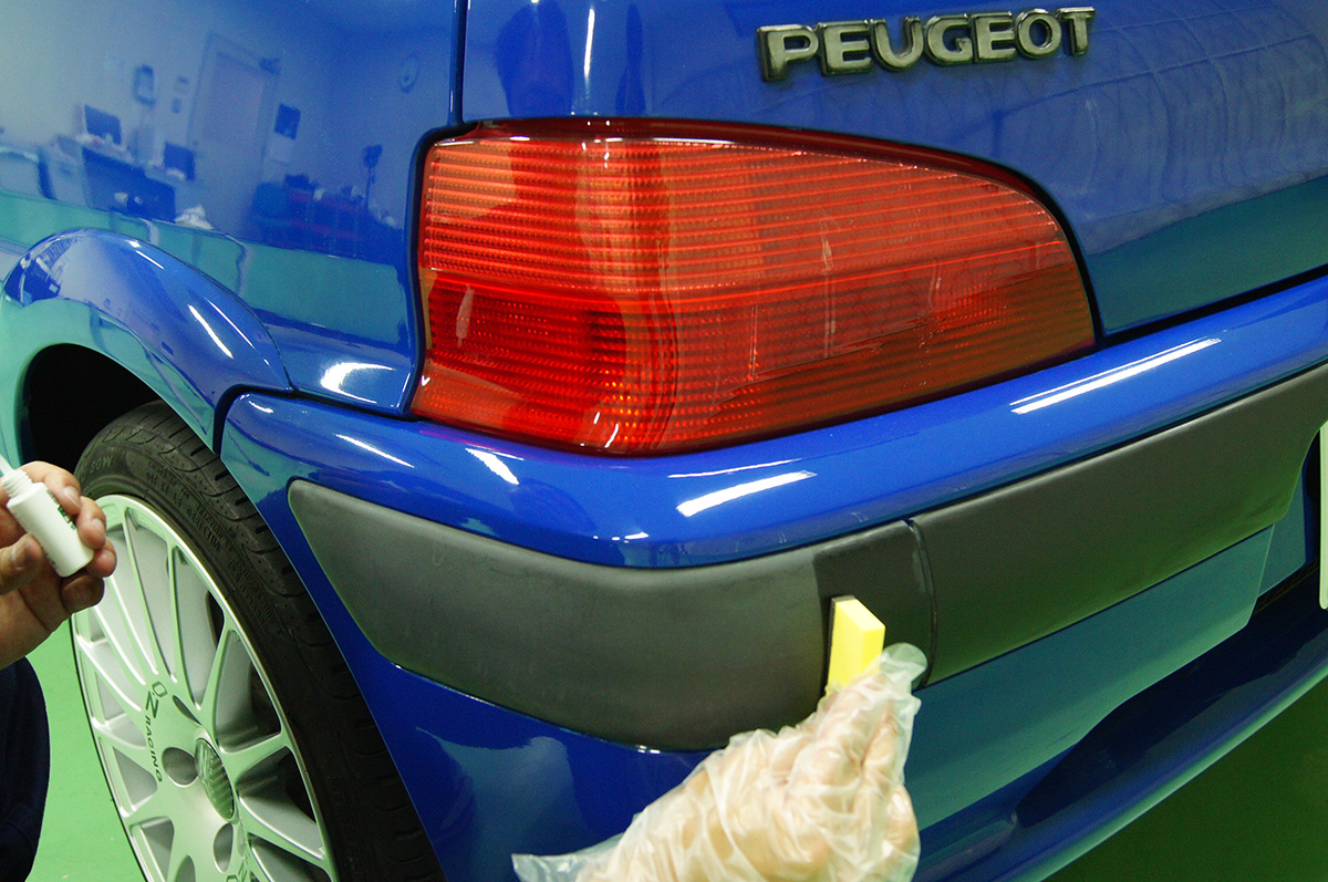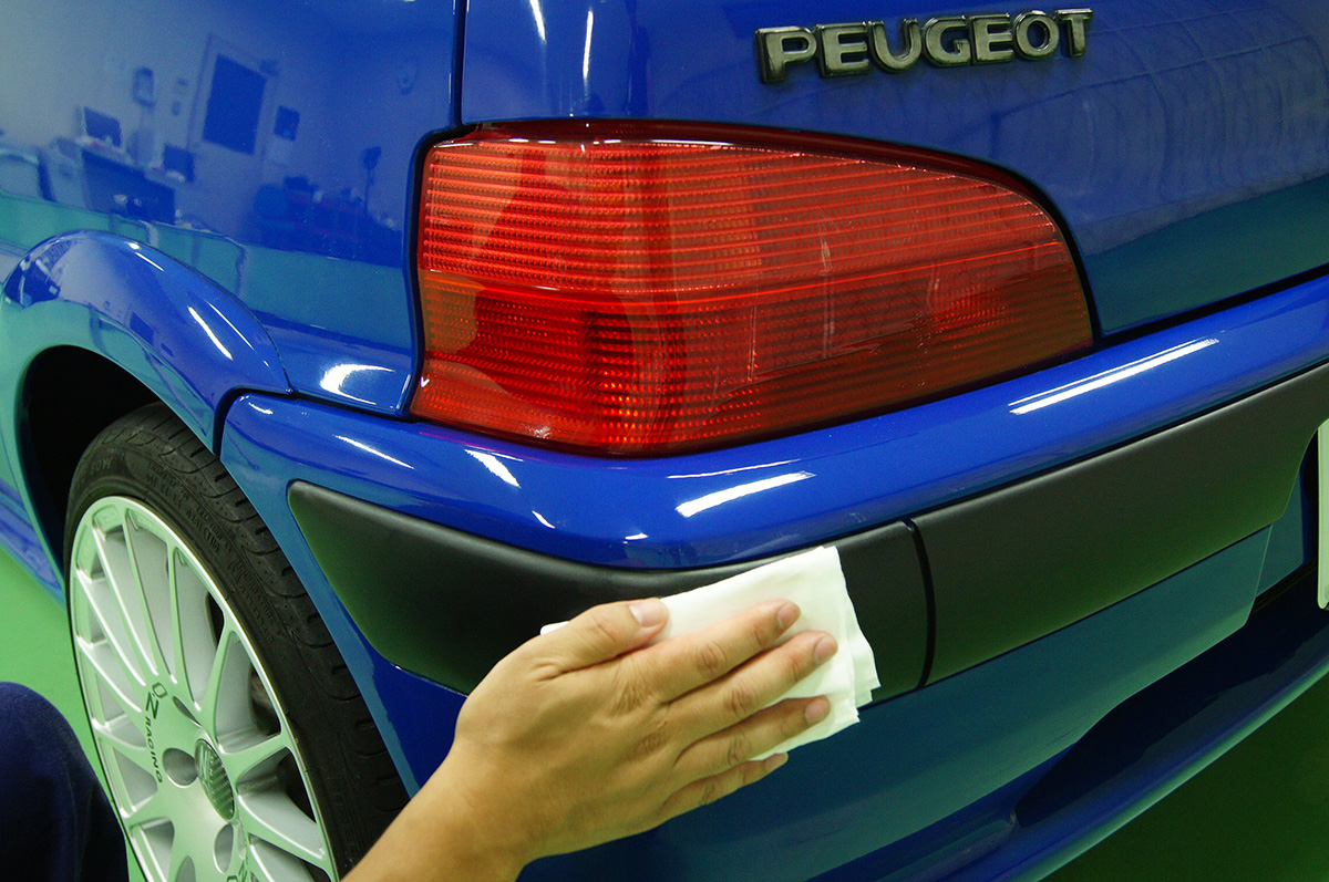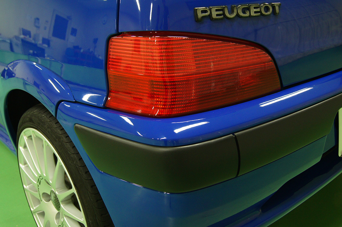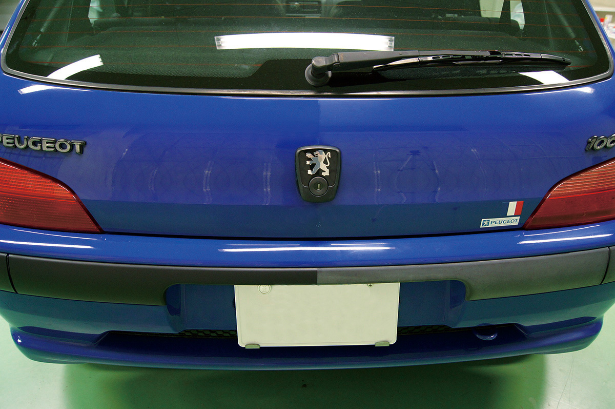 ただ、紫外線等によるダメージを受け、年月の経過と共に、気が付くと白く劣化してしまい、車のイメージはどことなくぼやっとした、古びたイメージになってしまいます。今回の「PEUGEOT-106」も19年という年月とともに、ブラックパーツがすっかり白化してしまい、全体的に古い印象を与えてしまっています。