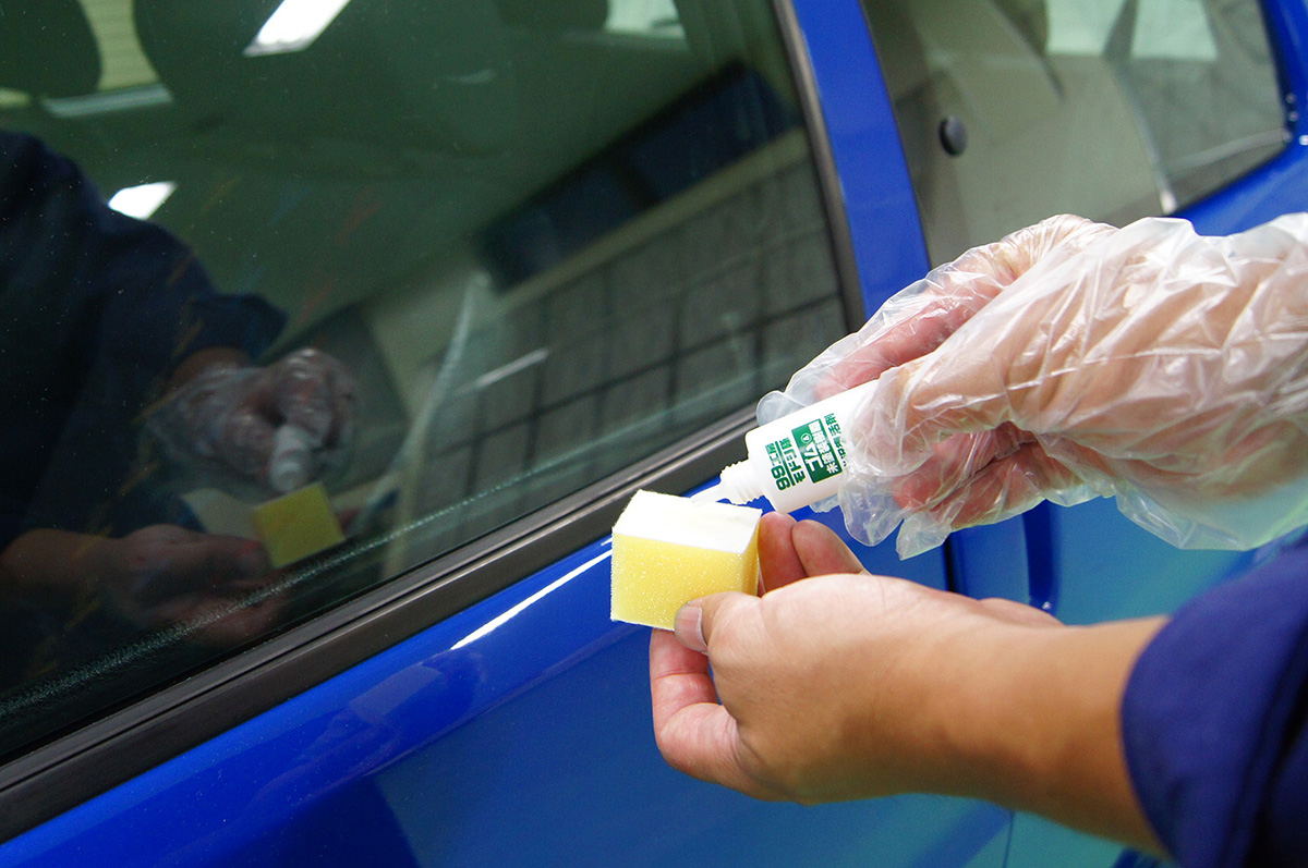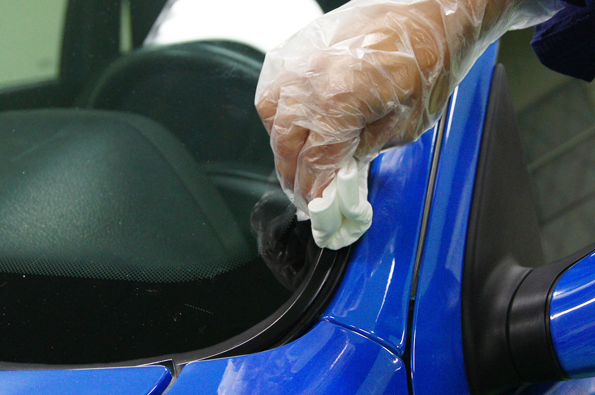 ゴム素材や軟質樹脂素材は硬質樹脂素材に比べ液剤を吸い込みやすいので、吸い込みが止まるまでじゅうぶんに塗り込みます。