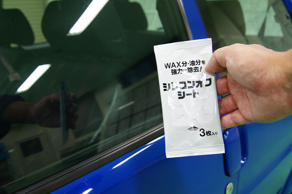 付属のシリコンオフシートでしっかりと施工部分の油分、汚れを除去します。