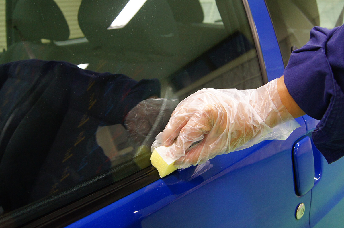 汚れの除去が完了すると早速コート剤の塗布作業ですが、今回は前回と違い、スポンジ面が白い「軟質樹脂用スポンジ」を使用していきます。