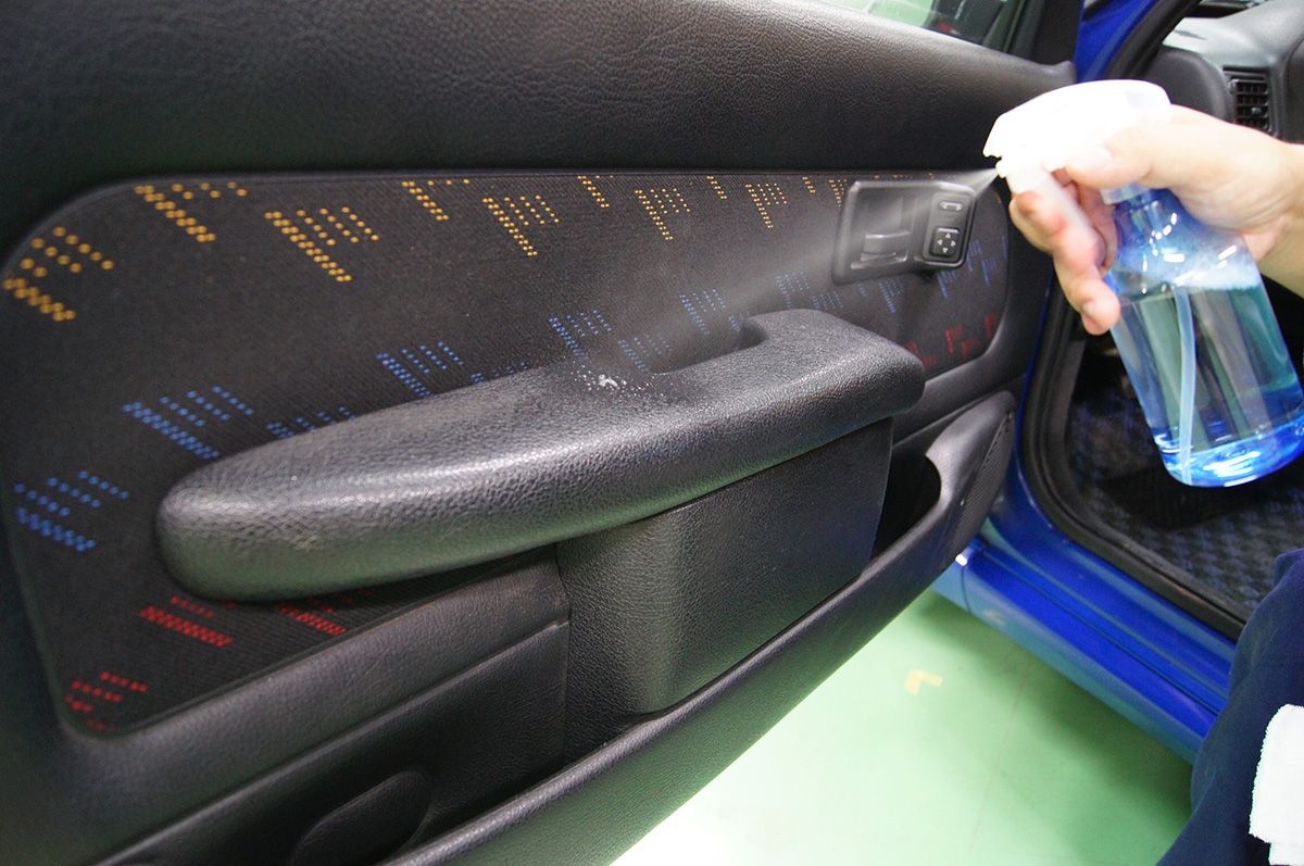 ドアの内側もクリーニング。広範囲の部分は、このように直接スプレーしても問題ありません。