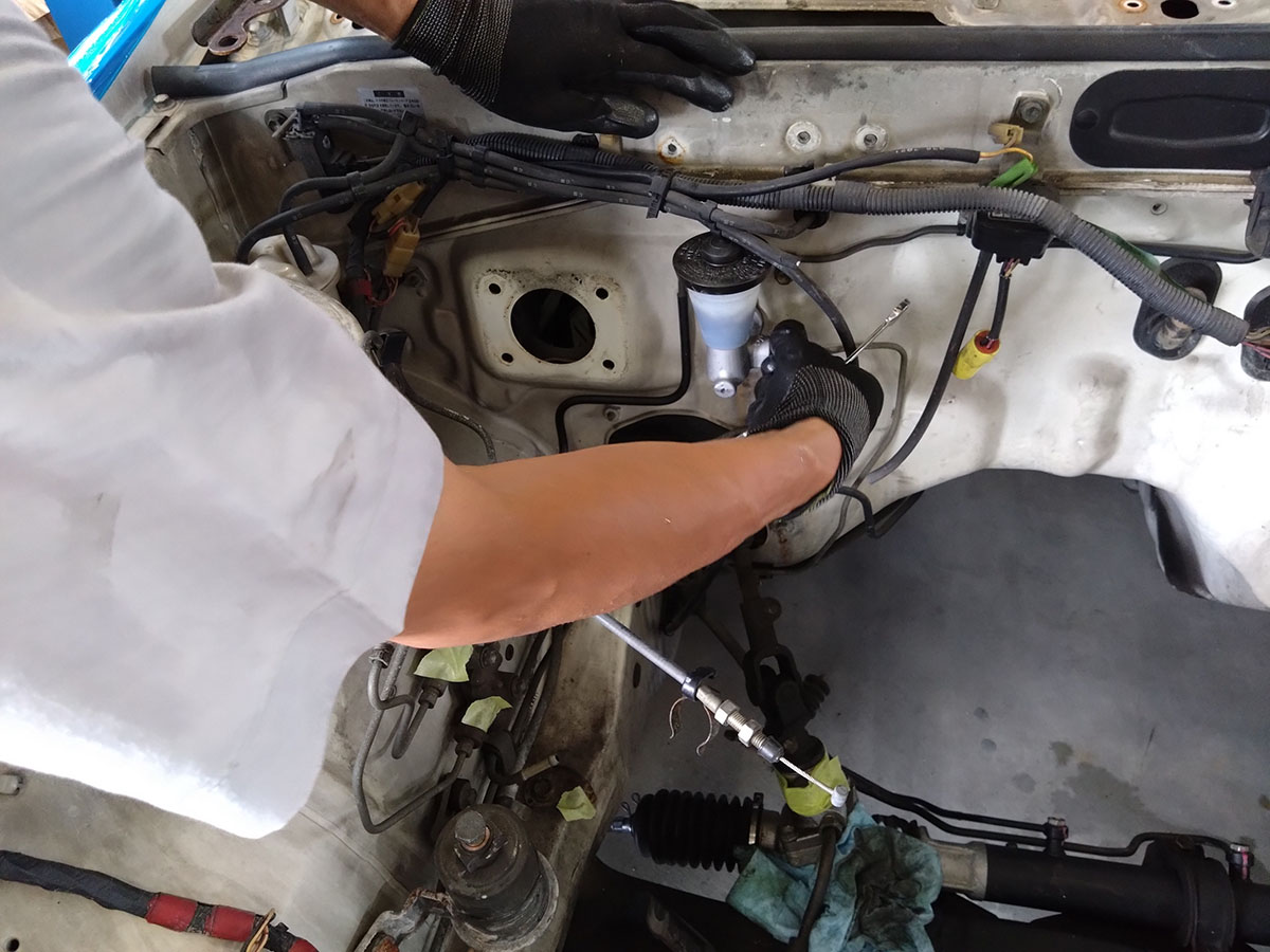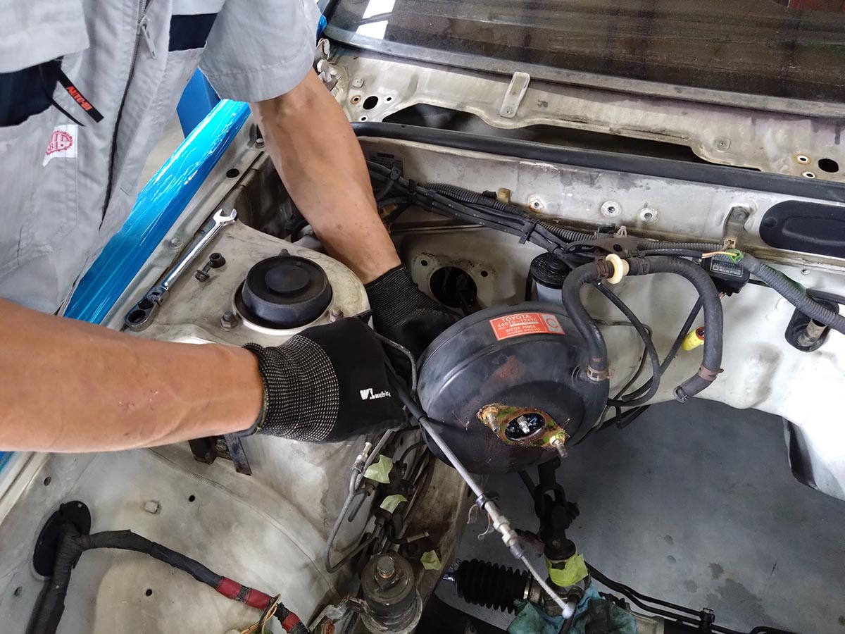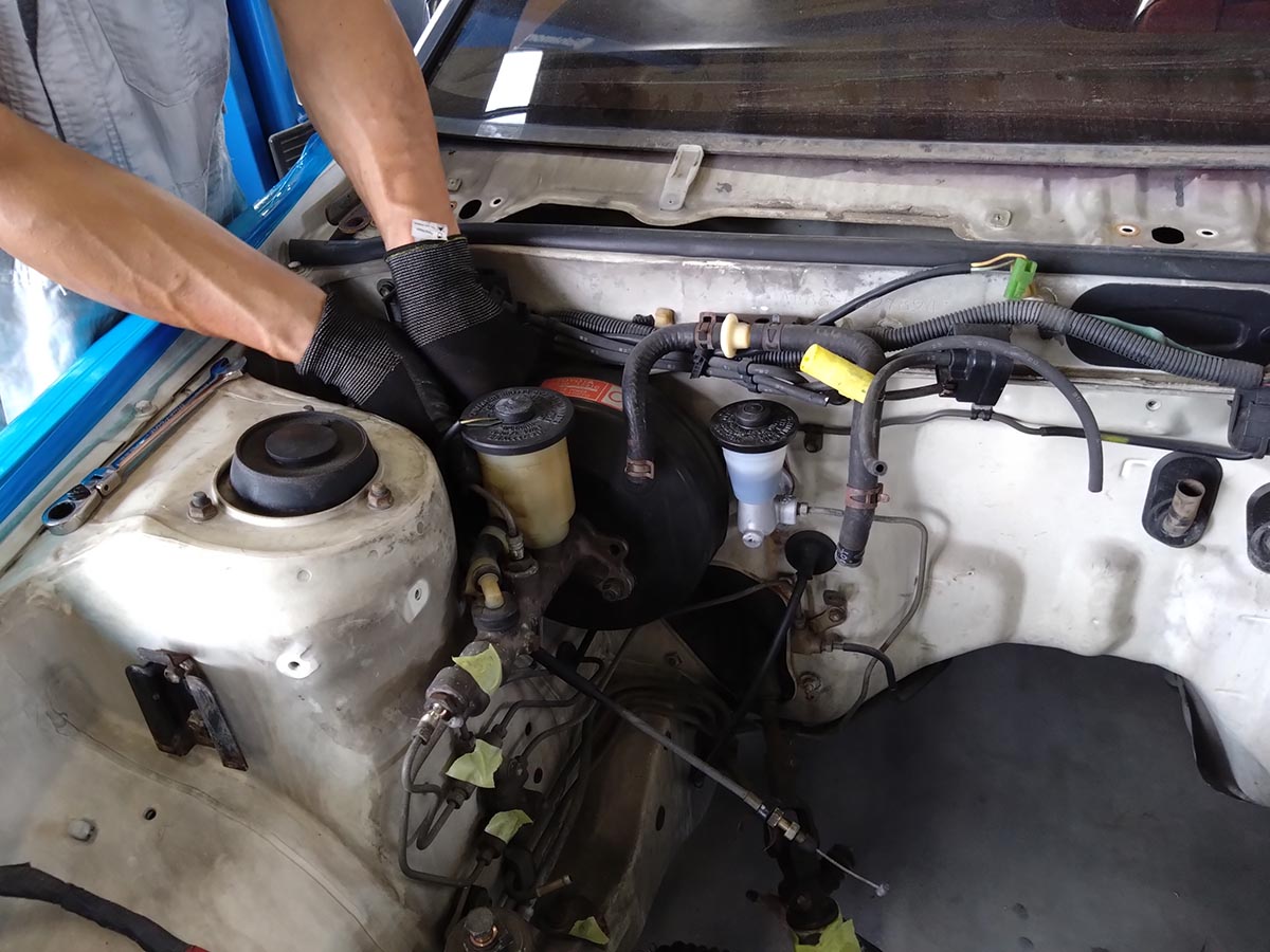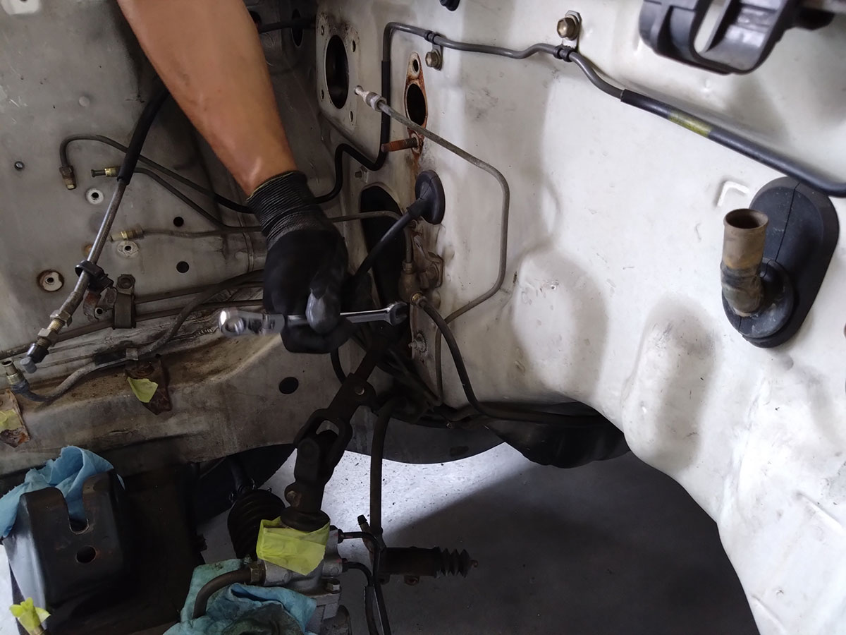 続いて、運転席側のペダル部分についているマスターバックのナットを外します。