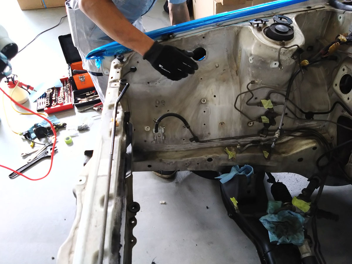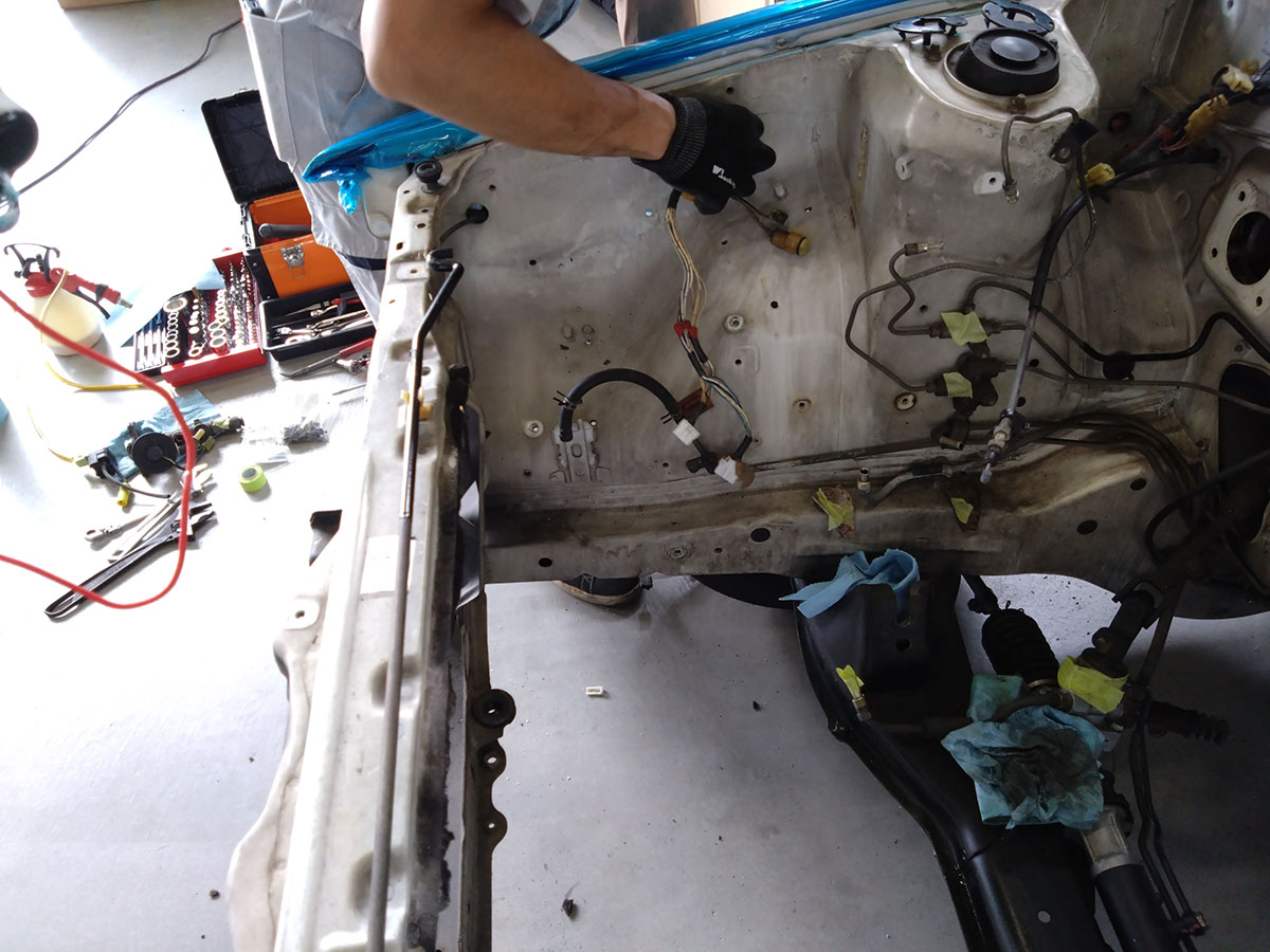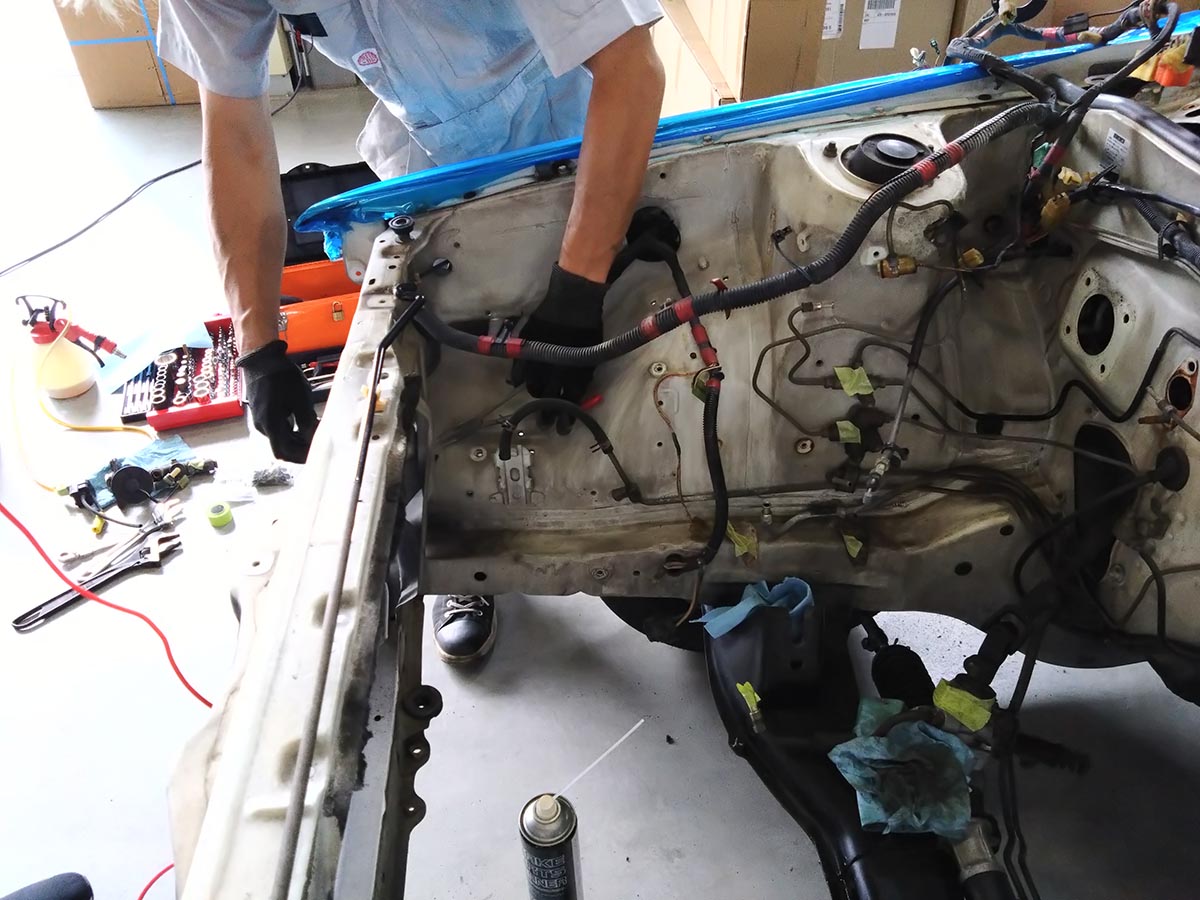 今回は、エンジンルームの塗装に向けた作業の最終章、エンジンルーム内に残った部品や配管を外してエンジンルームを空にしていきます。