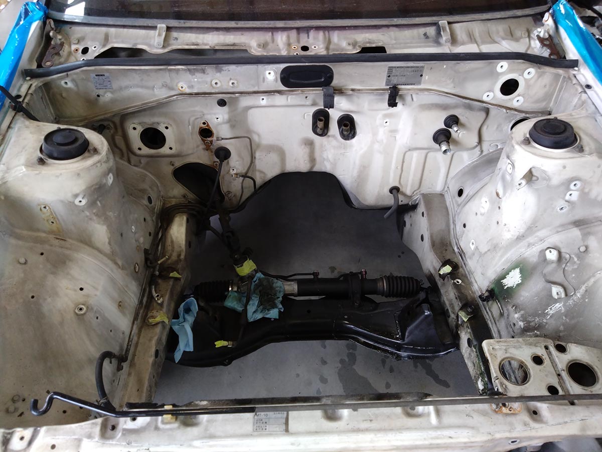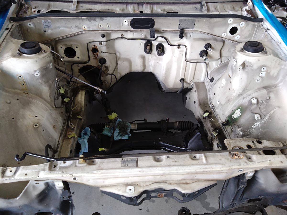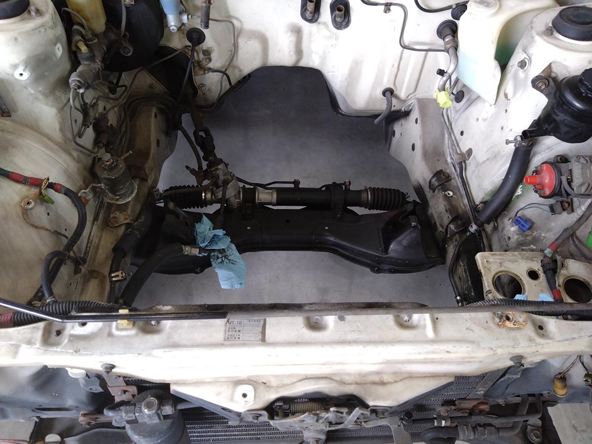 ほとんど空になった「トヨタ AE86(ハチロク)」のエンジンルーム。