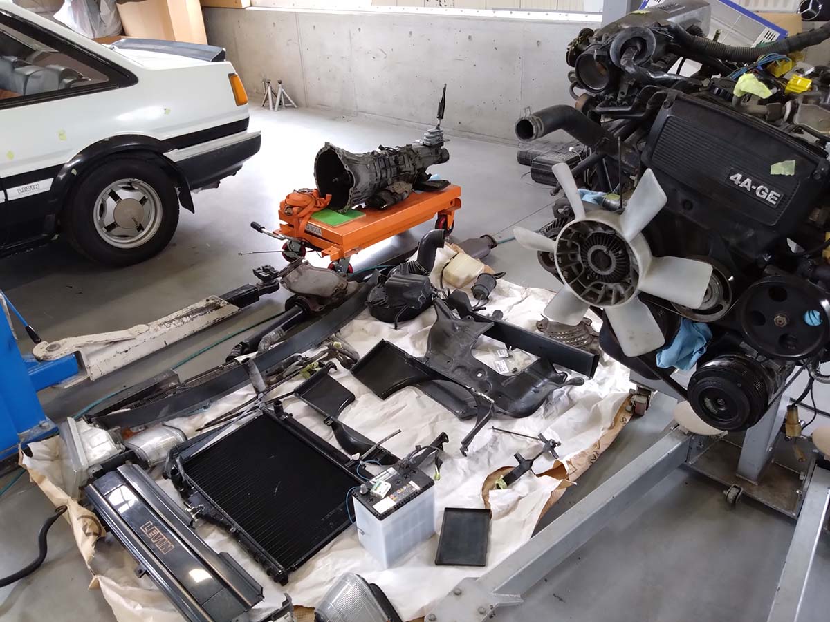 前回、車体から降ろしたエンジンをさらにトランスミッションとエンジンメンバーから切り離し、エンジン単体まで分解した「トヨタ AE86(ハチロク)」。