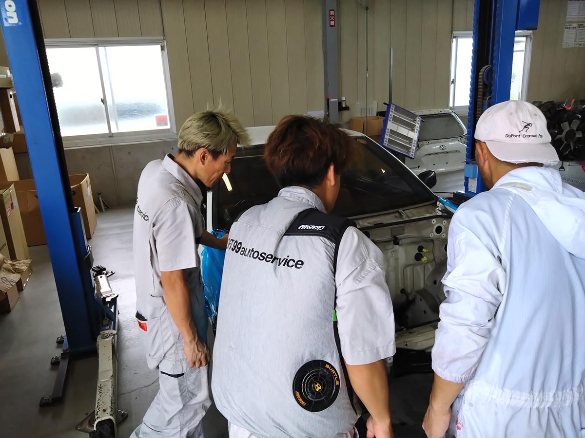 メカニックスタッフから鈑金塗装スタッフへと、作業の引継ぎへ向けた打ち合わせ。