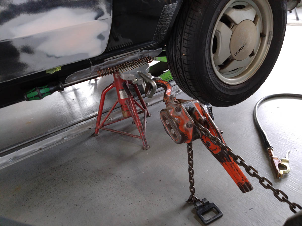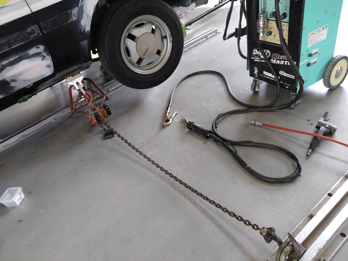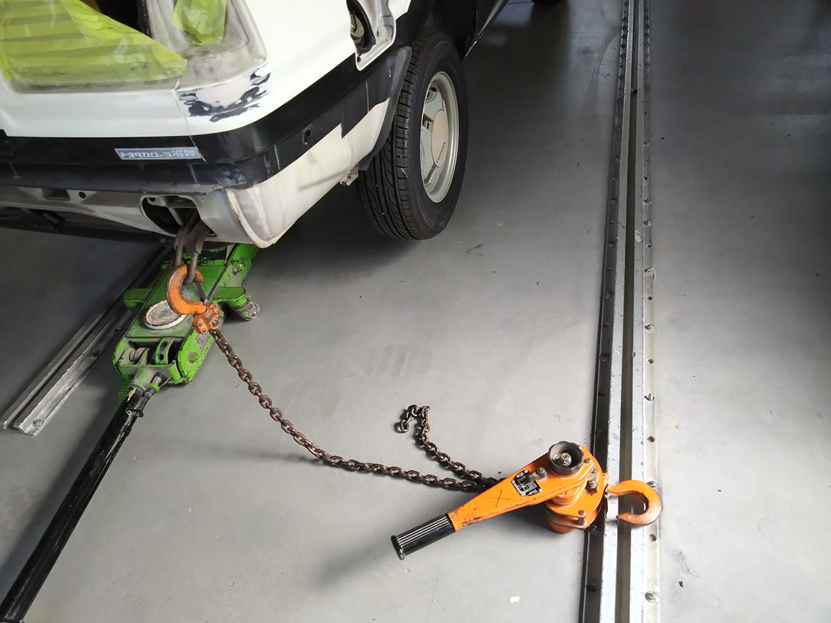 チェーンブロックでスタッドリングを引っ張り、凹んだパネルを出していきます。