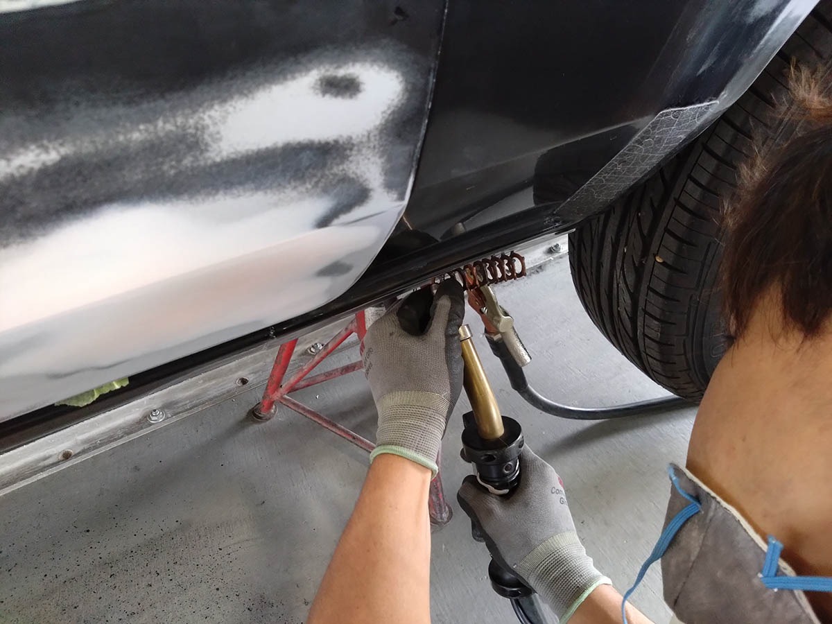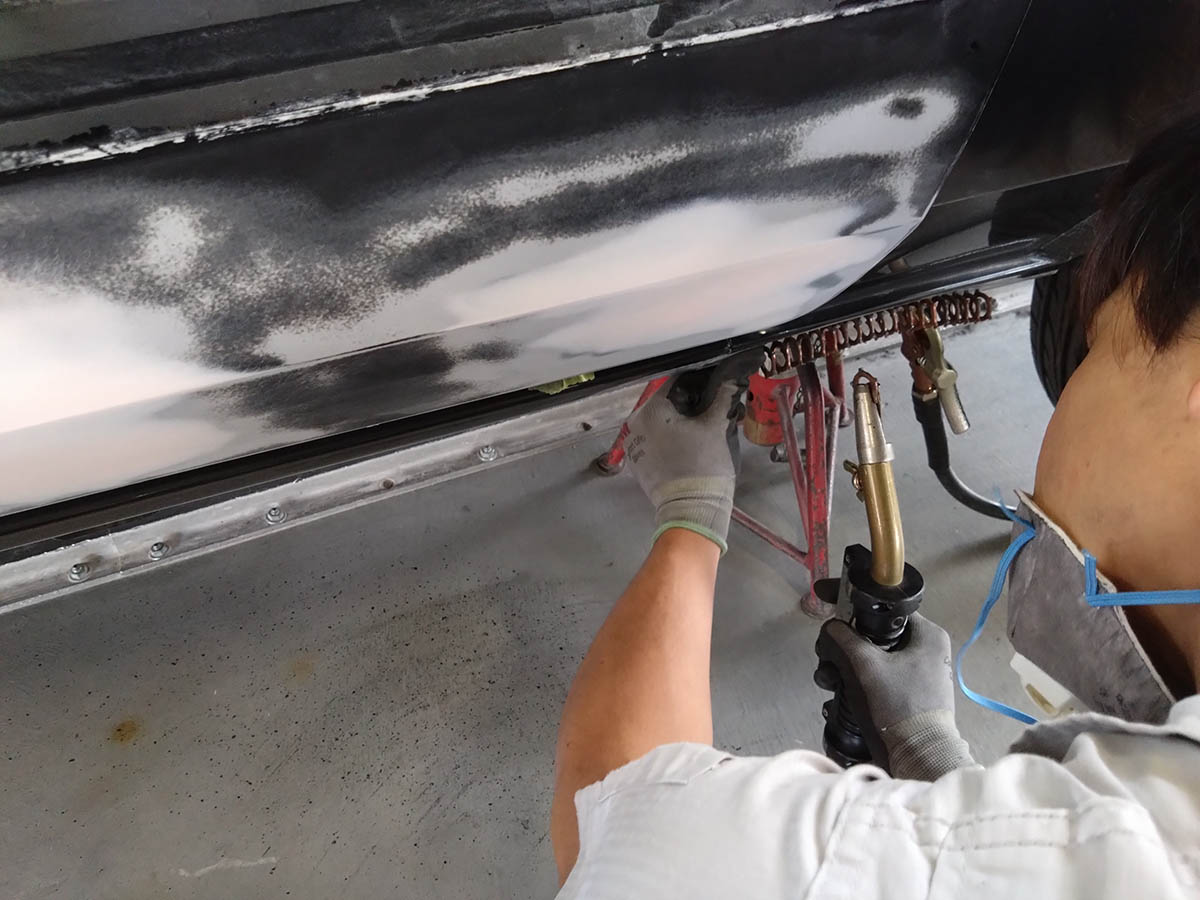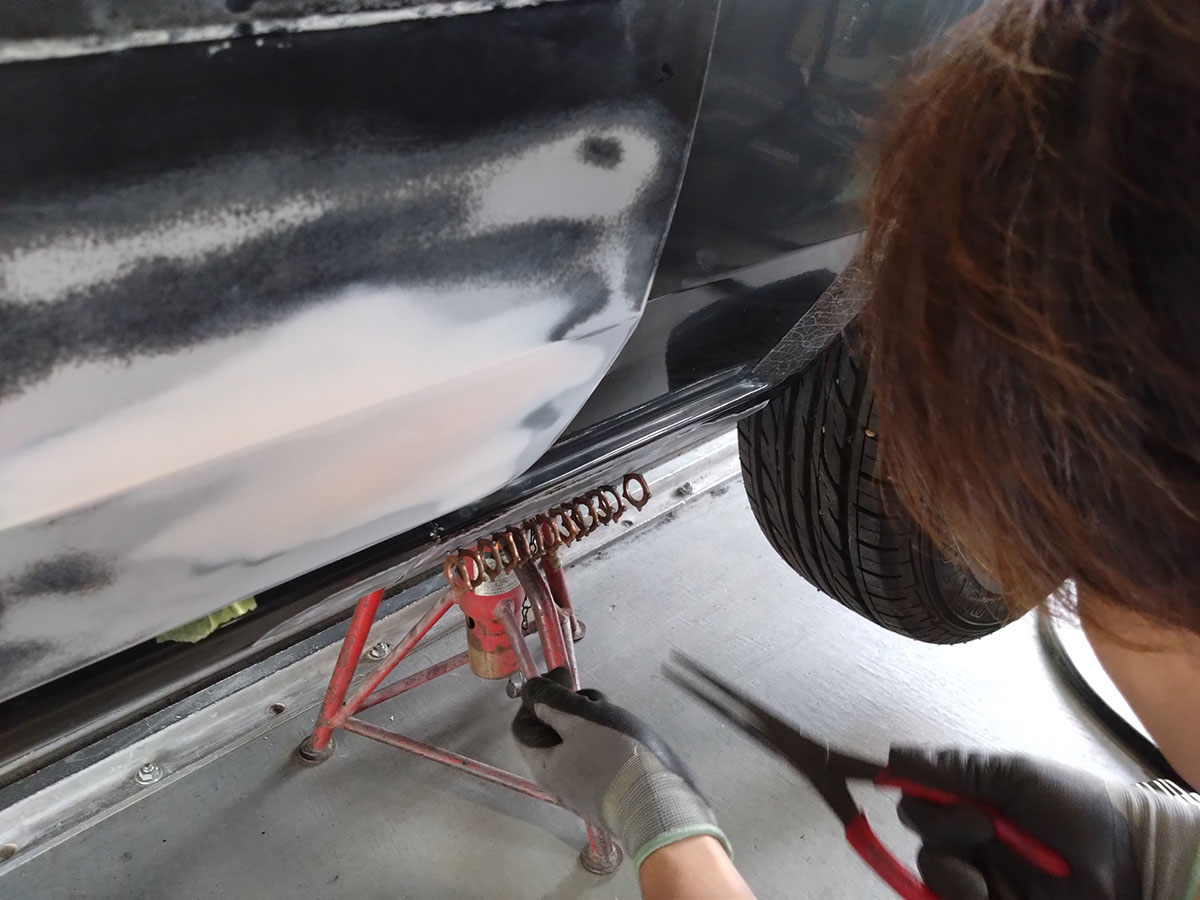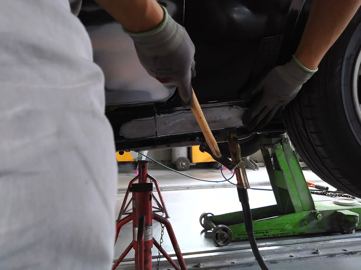 この作業を行う中、鈑金箇所は鉄の性質上伸びてしまいますので、業界用語の”絞り”と呼ばれる、伸びてしまった箇所に熱を加え、その熱が冷めることで鉄を縮めていく作業を同時に行いながら、鈑金箇所を調整していきます。