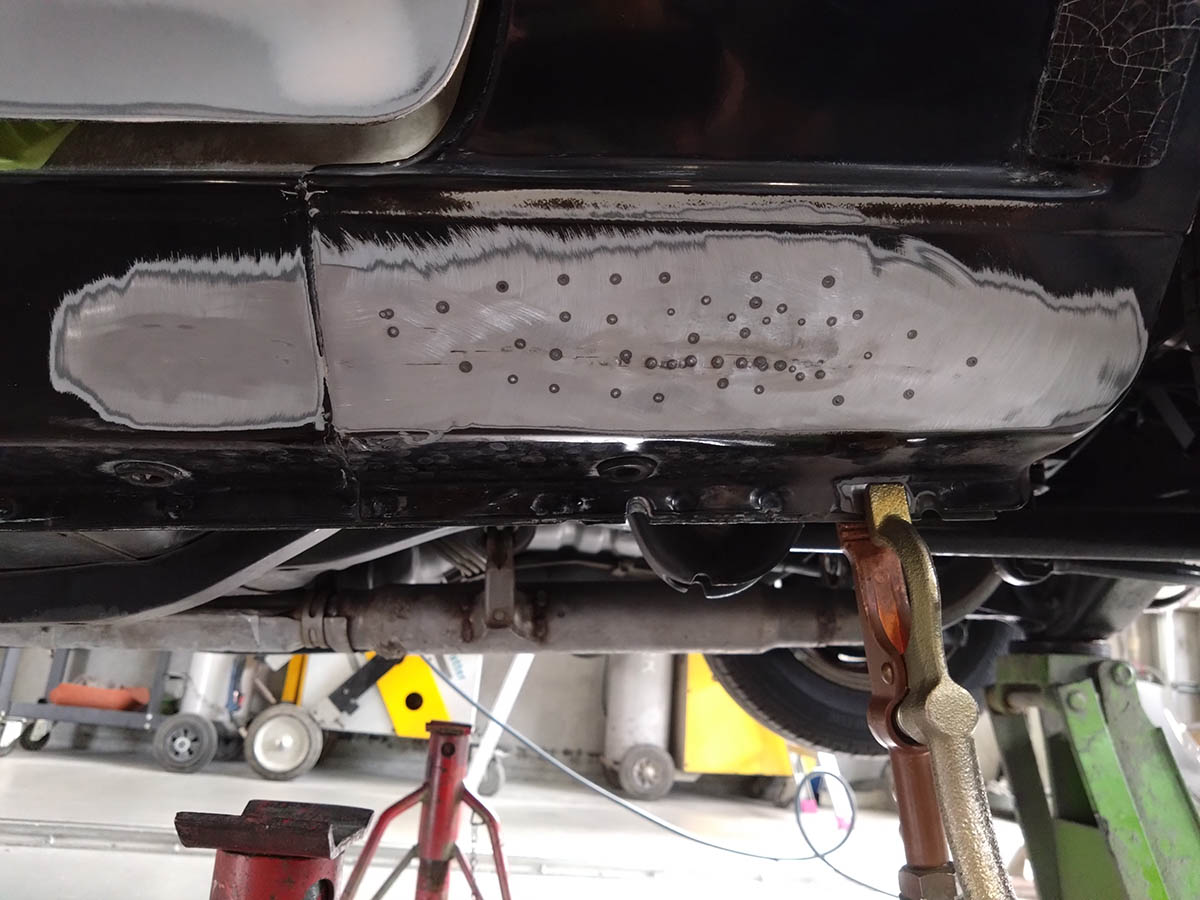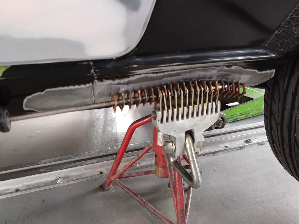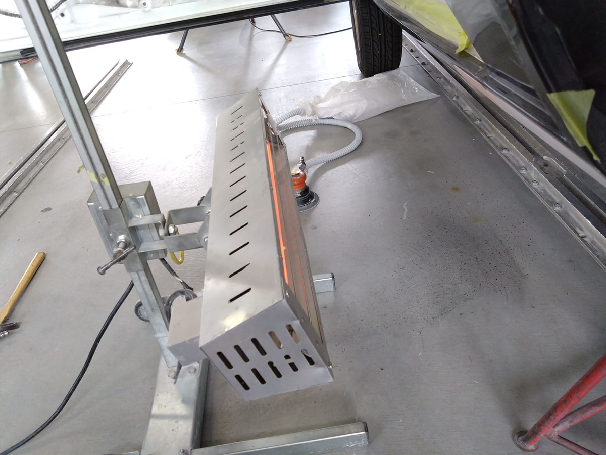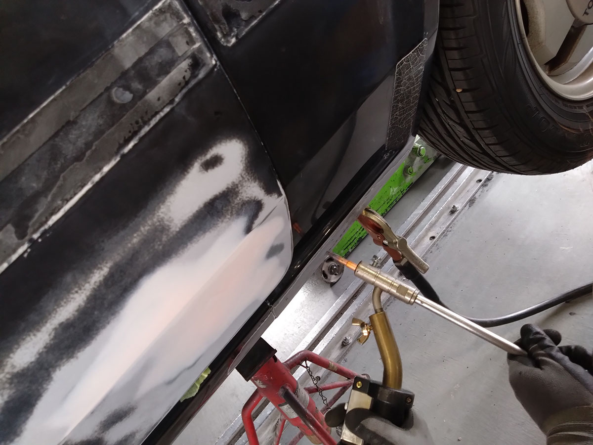 この作業を行う中、鈑金箇所は鉄の性質上伸びてしまいますので、業界用語の”絞り”と呼ばれる、伸びてしまった箇所に熱を加え、その熱が冷めることで鉄を縮めていく作業を同時に行いながら、鈑金箇所を調整していきます。