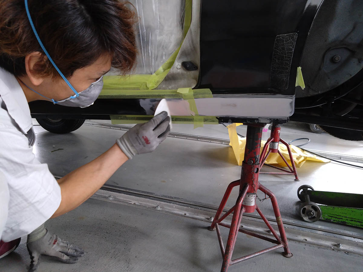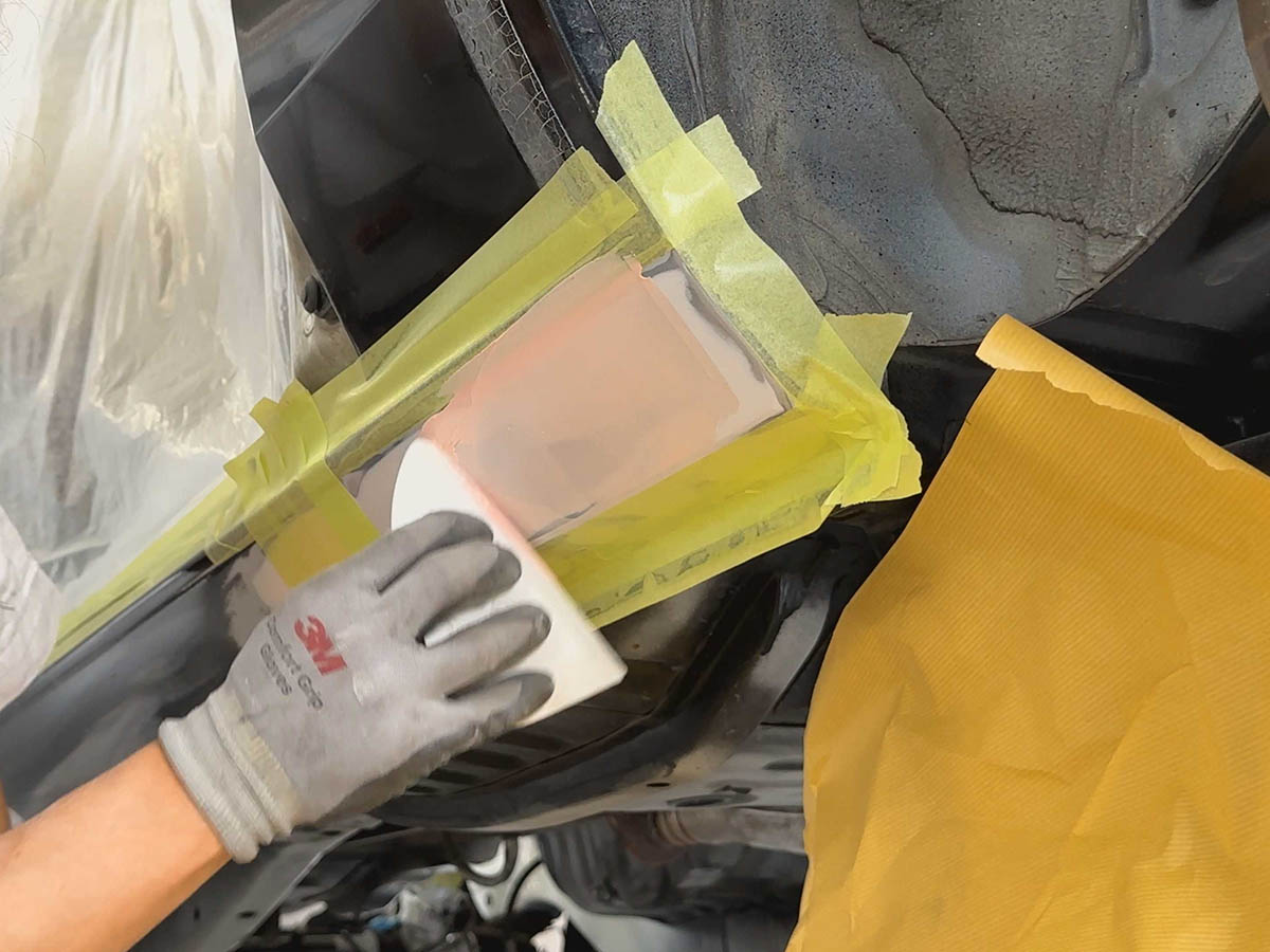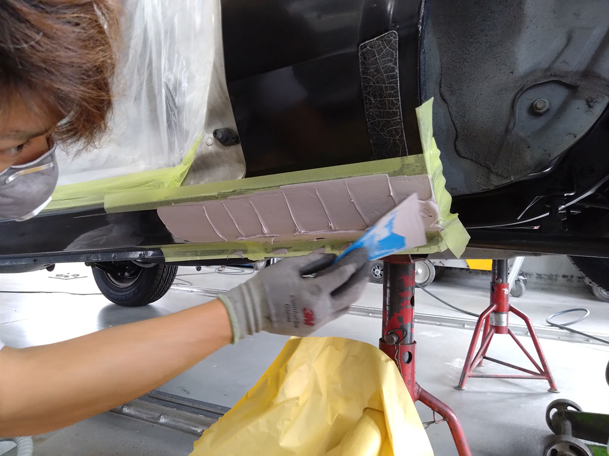 この凹みの部分は元々縦にプレスラインが入っていましたので、プレスラインに沿ってマスキングし、左右を分けてパテ盛り&研磨していくことで、最終的にプレスラインもしっかりと出るような完成を目指します。さすがはプロの技ですね。