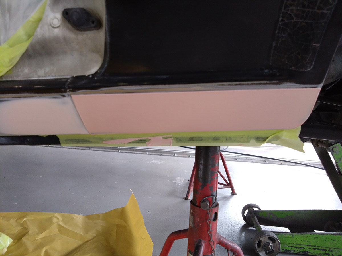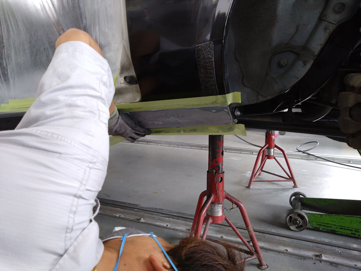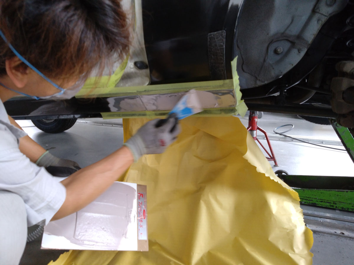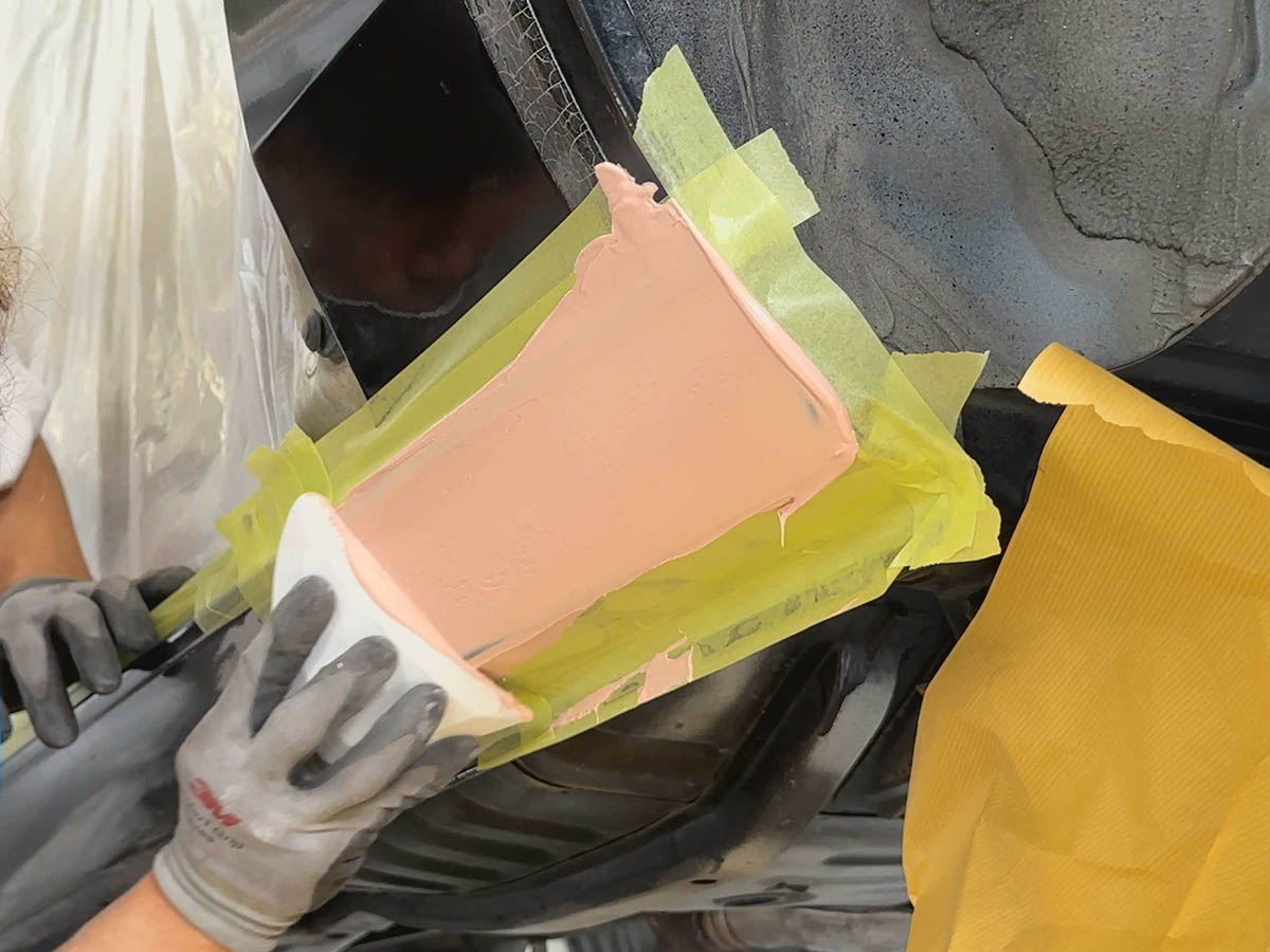 この凹みの部分は元々縦にプレスラインが入っていましたので、プレスラインに沿ってマスキングし、左右を分けてパテ盛り&研磨していくことで、最終的にプレスラインもしっかりと出るような完成を目指します。さすがはプロの技ですね。