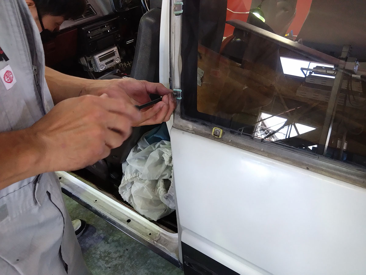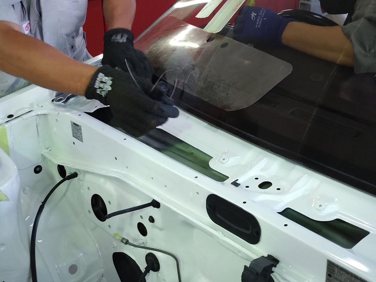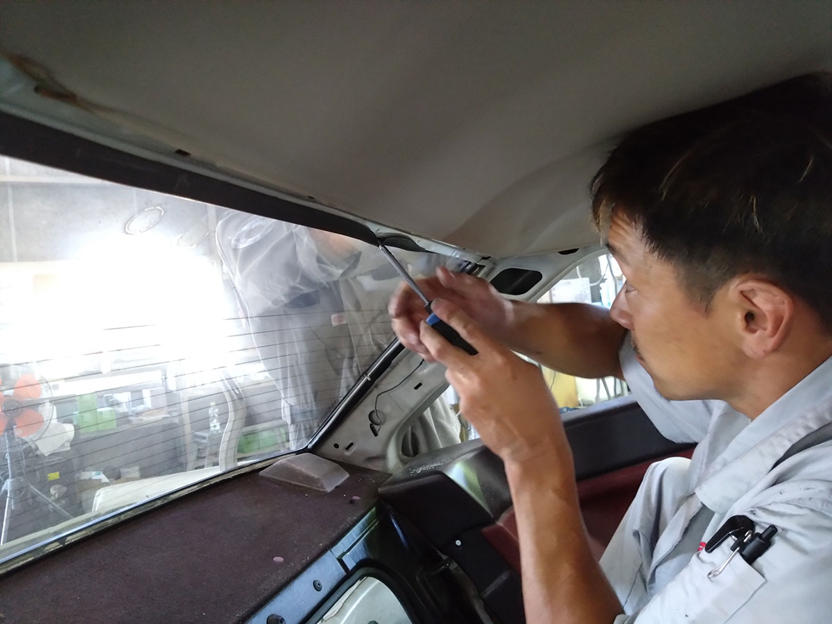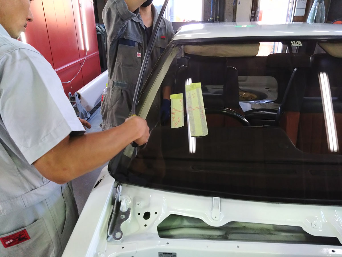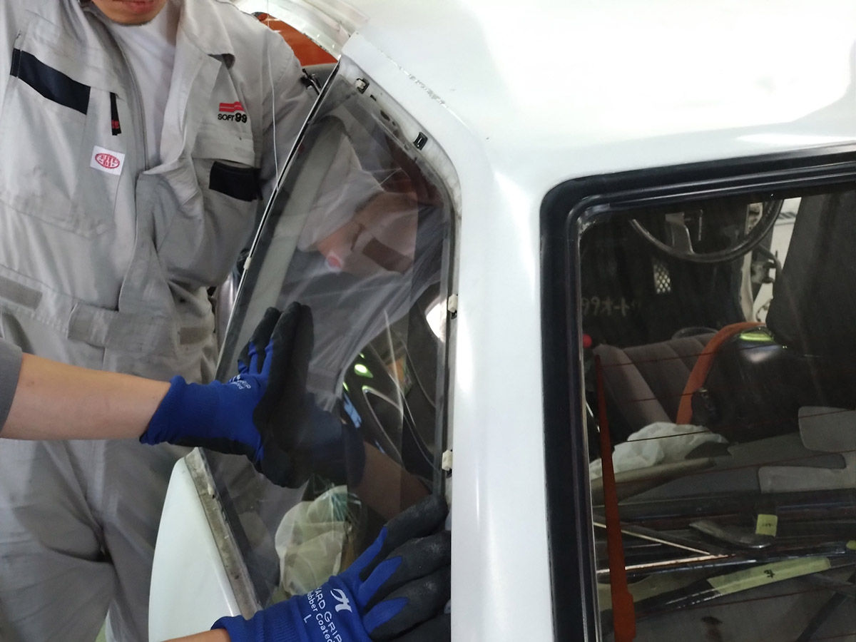 リアガラスのウェザーストリップは表裏をガラスで挟んでいる状態なので、車内と車外で作業を合わせて進めていきます。