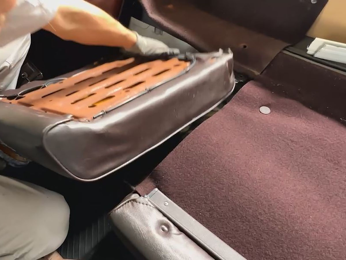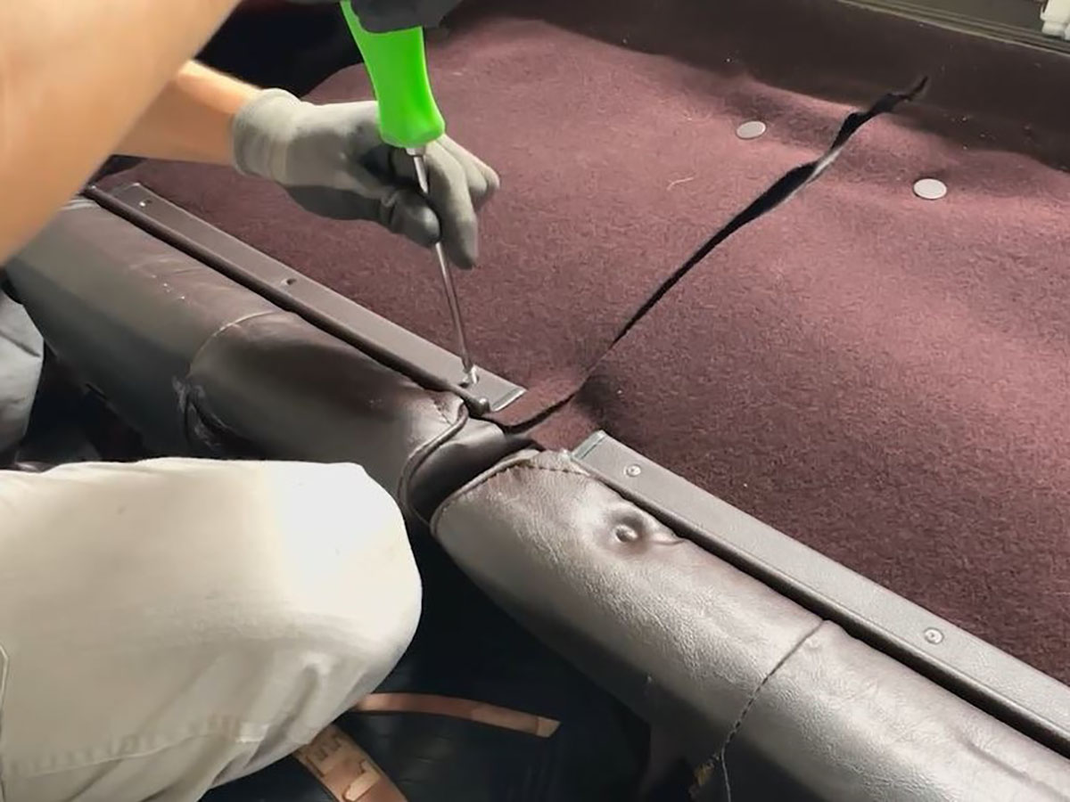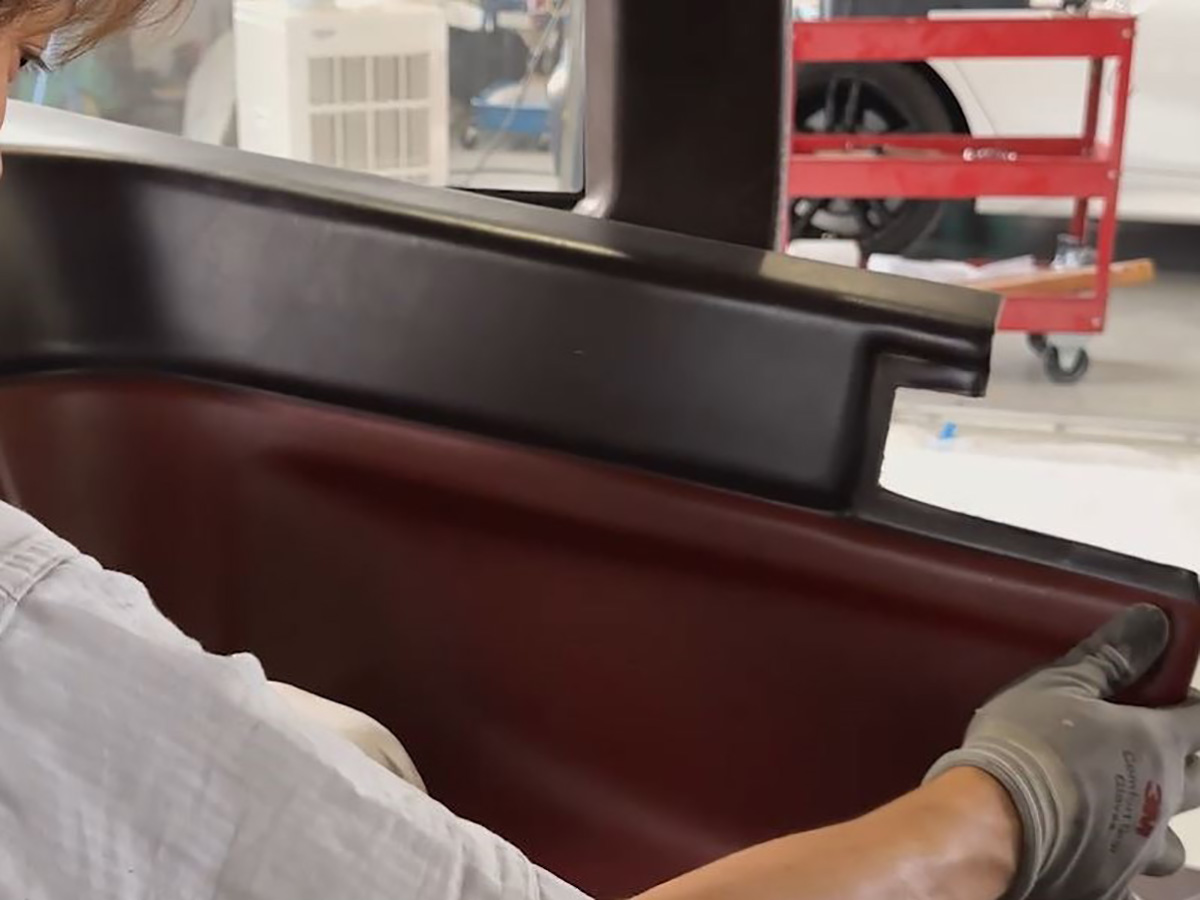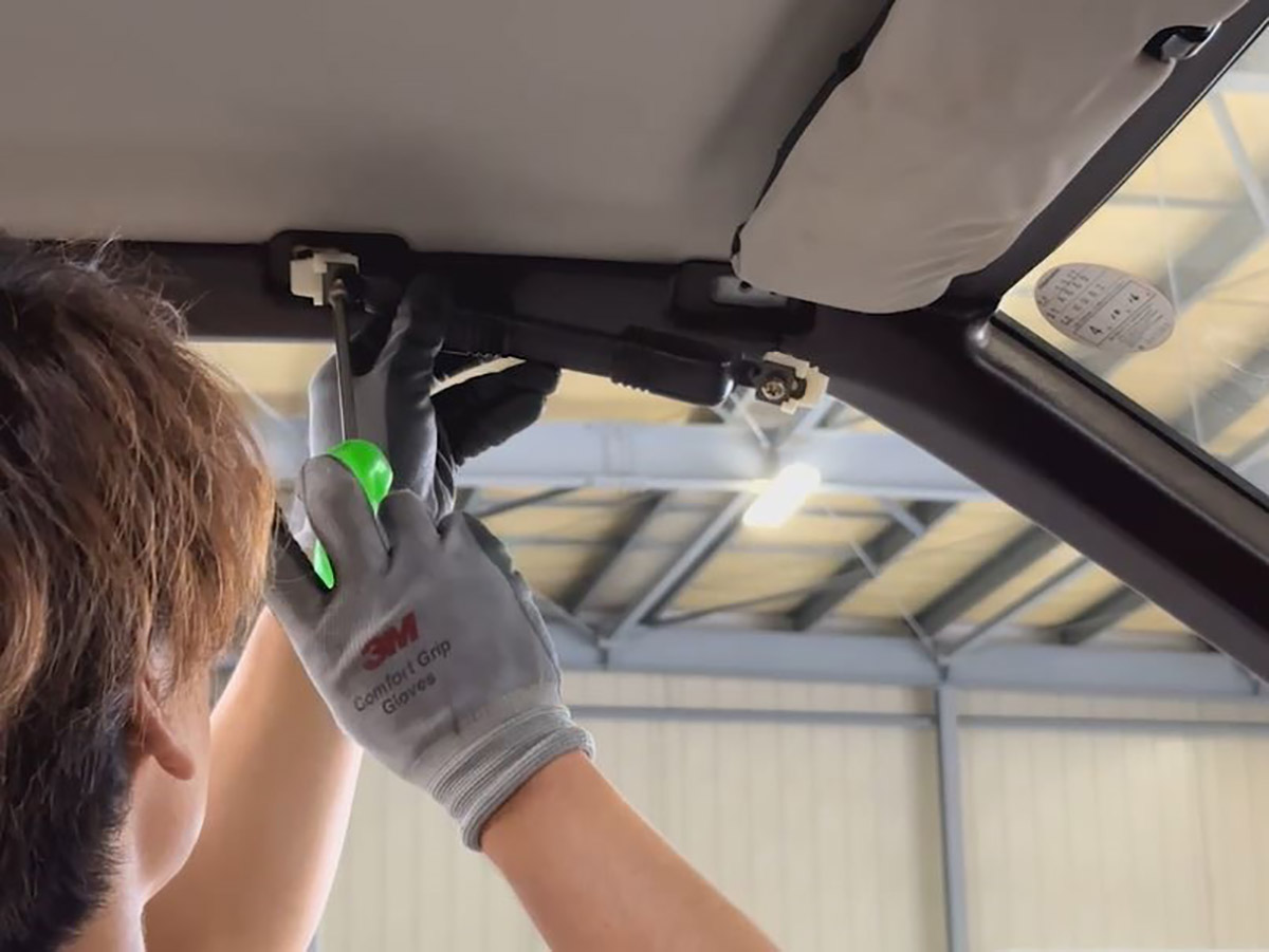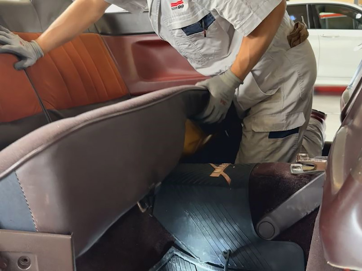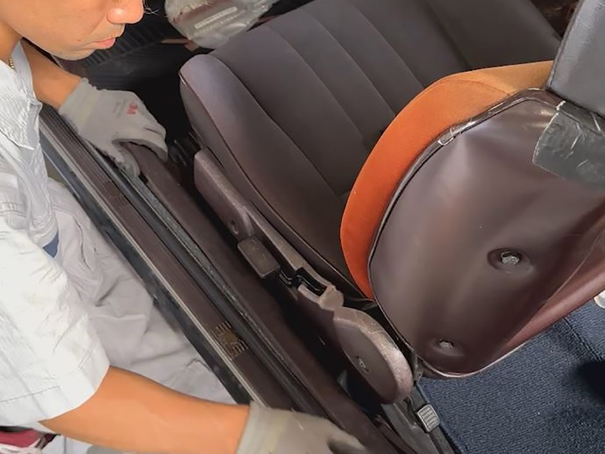 リアガラスのウェザーストリップは表裏をガラスで挟んでいる状態なので、車内と車外で作業を合わせて進めていきます。