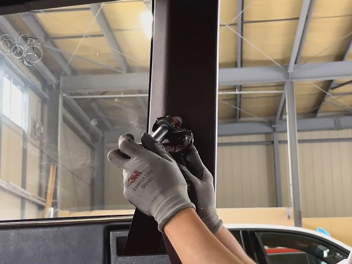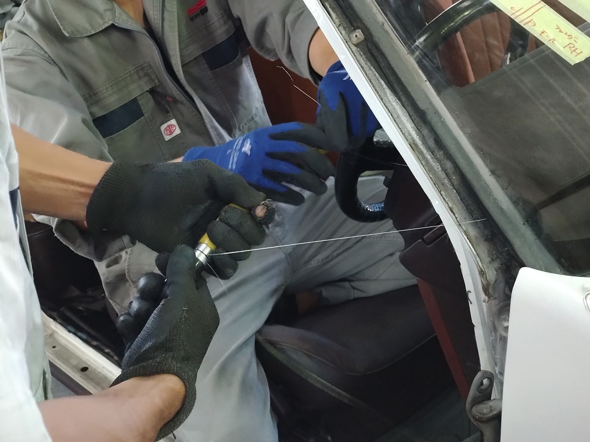 ガラスとボディの間にスチールワイヤーを通し、接着剤をカットしていきます。