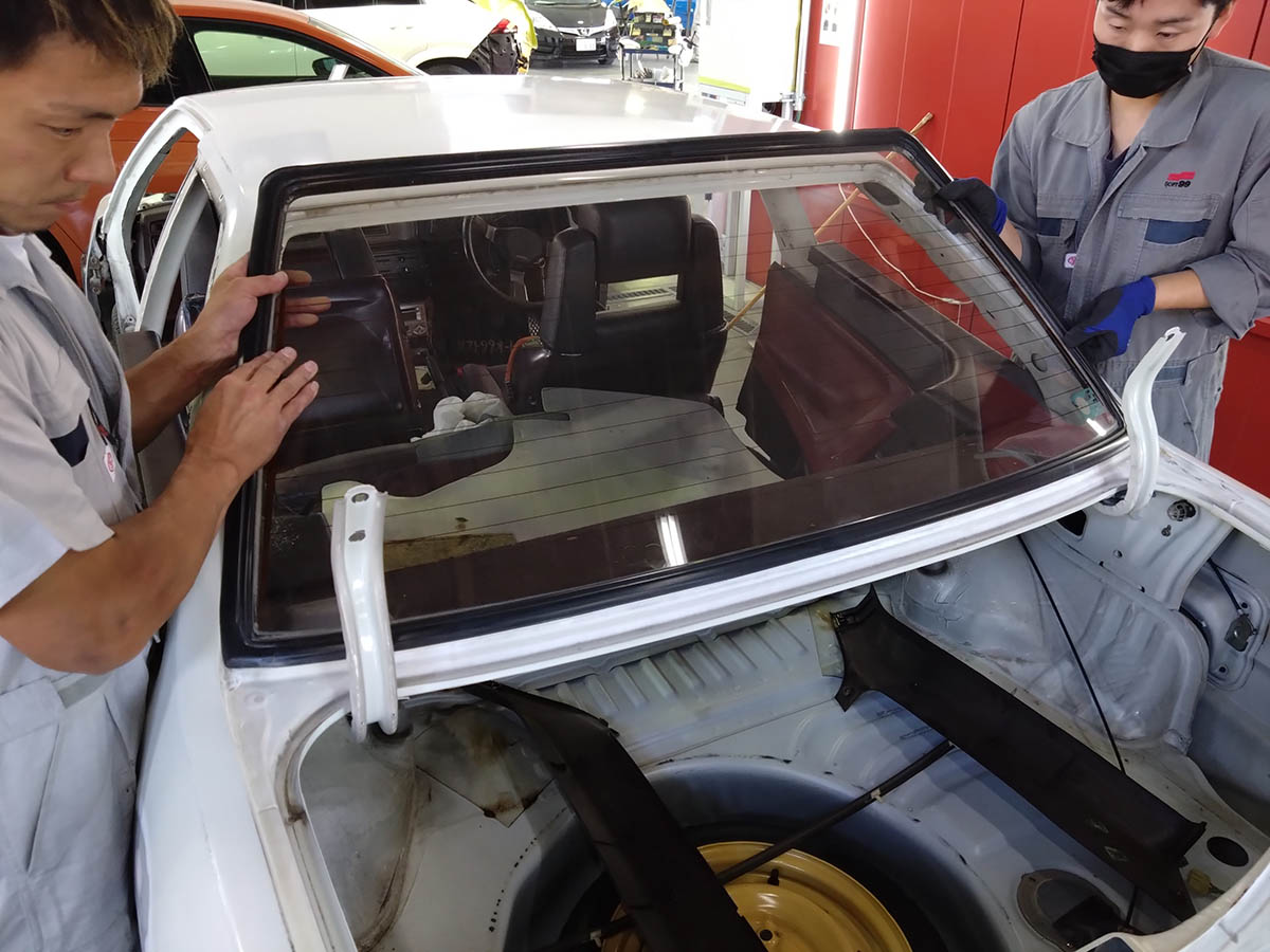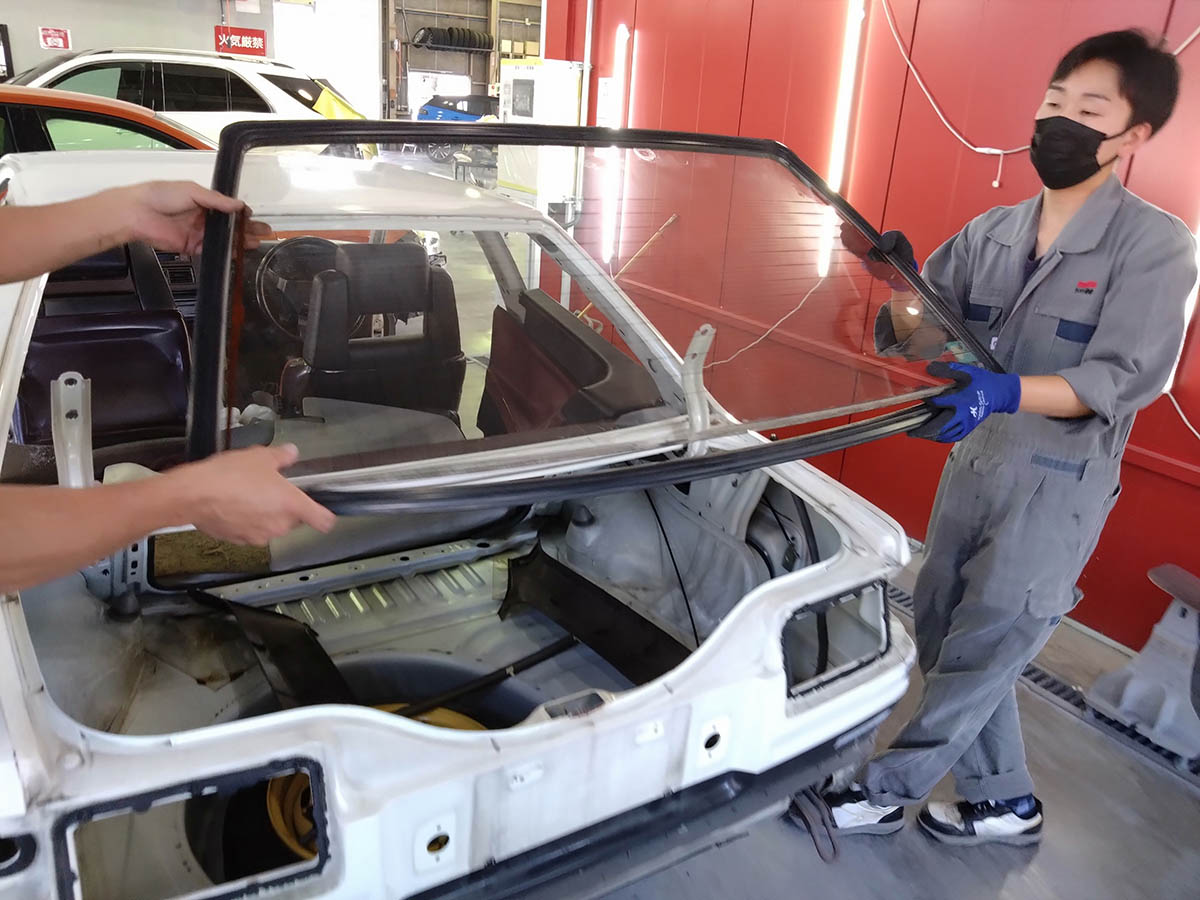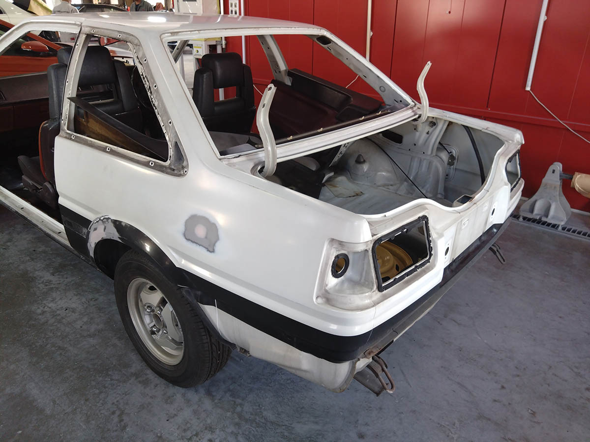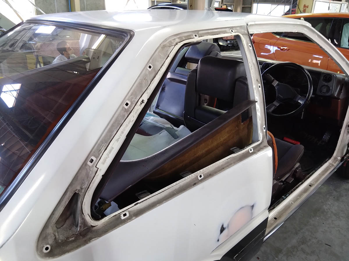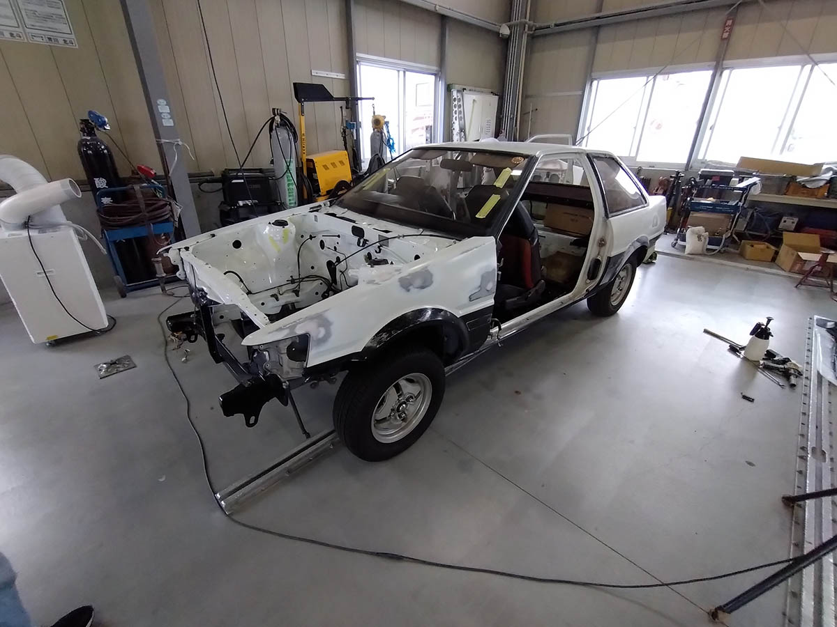今回は、前回でボディの鈑金が仕上がった「トヨタ AE86(ハチロク)」のボディ塗装に向けた、内装パーツとガラスの取り外し作業の様子をお届けしたいと思います。