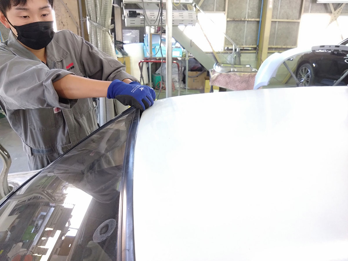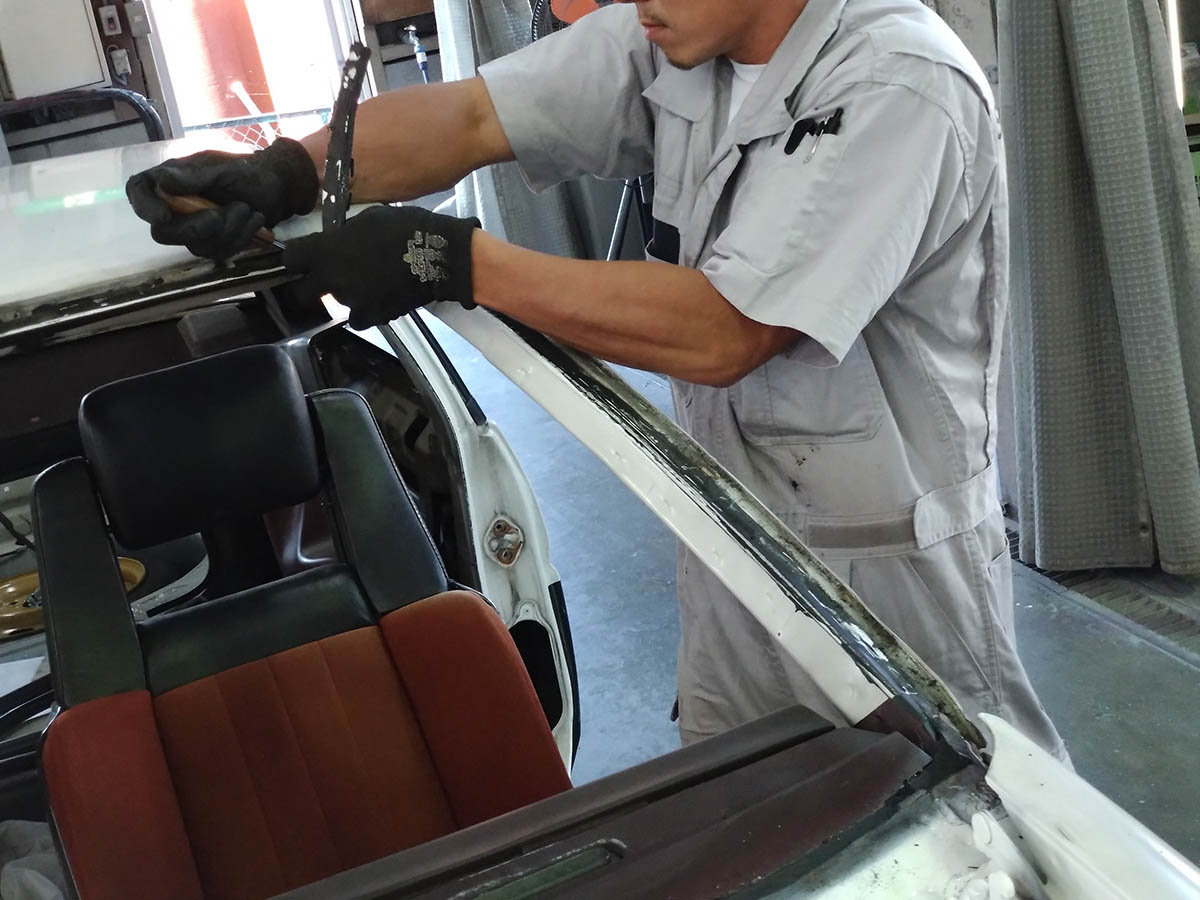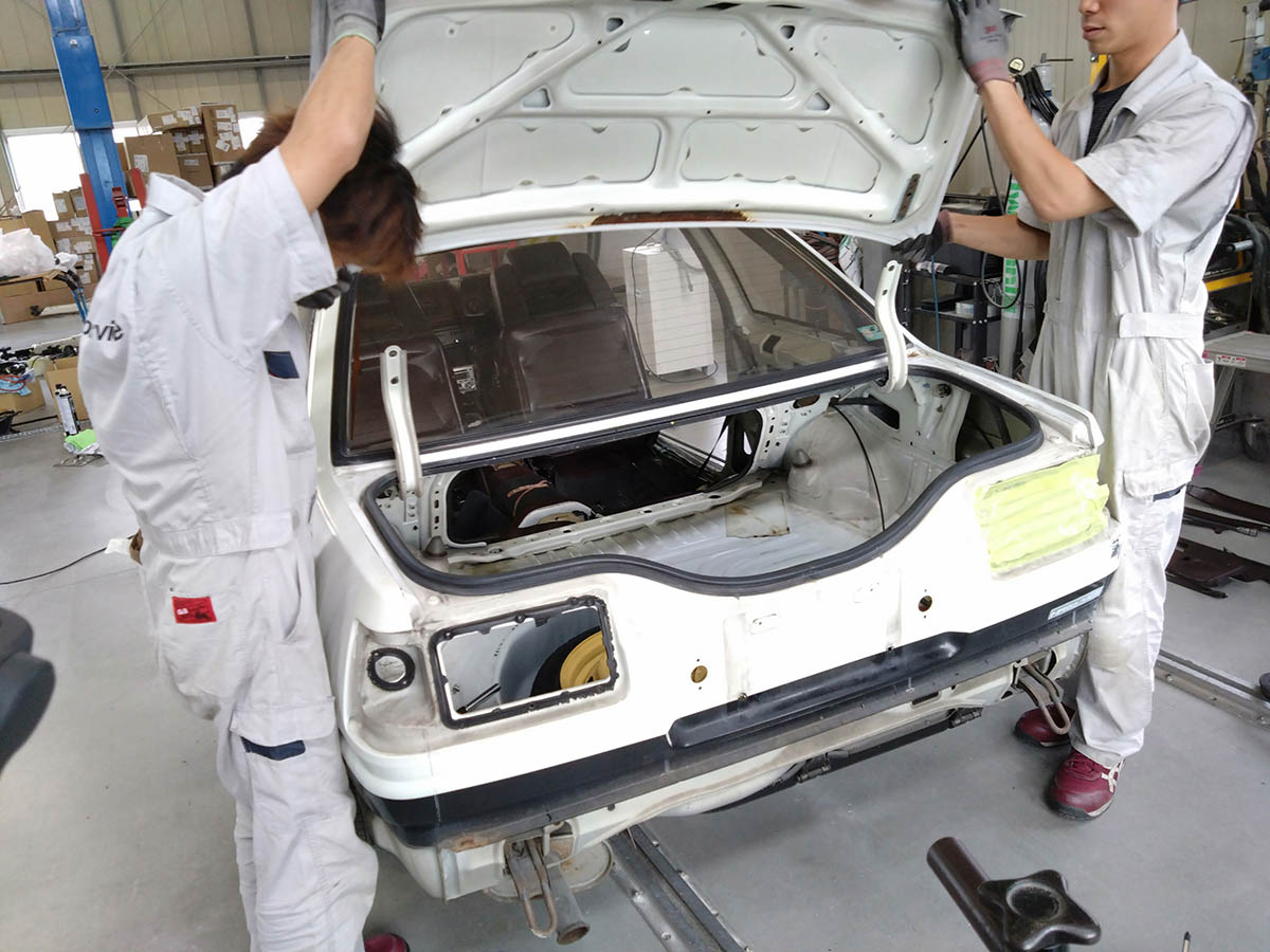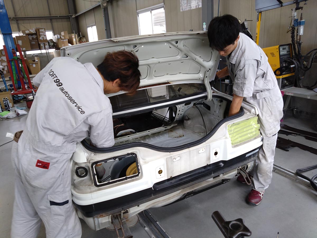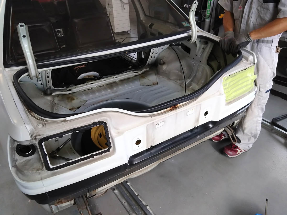 今回は、前回でボディの鈑金が仕上がった「トヨタ AE86(ハチロク)」のボディ塗装に向けた、内装パーツとガラスの取り外し作業の様子をお届けしたいと思います。