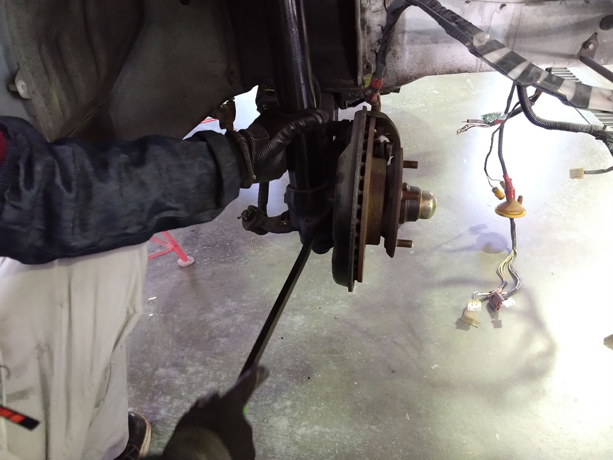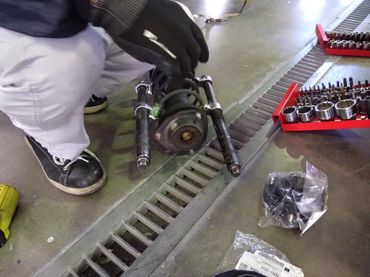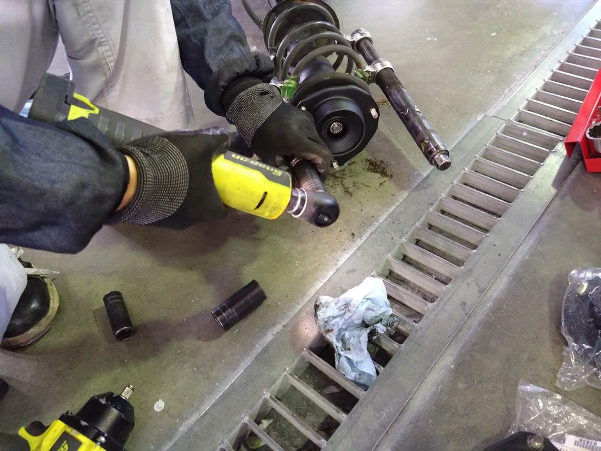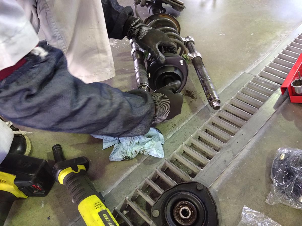 ロアアームとストラットの止めているボルトを外し、ストラットを切り離していきます。
