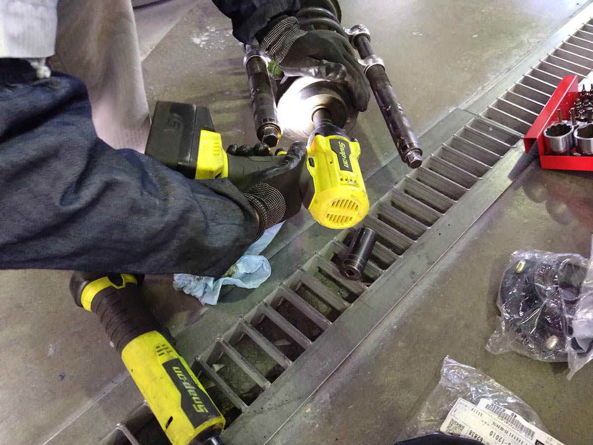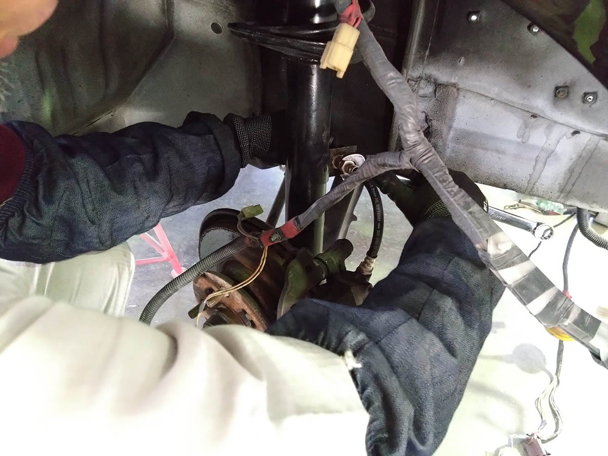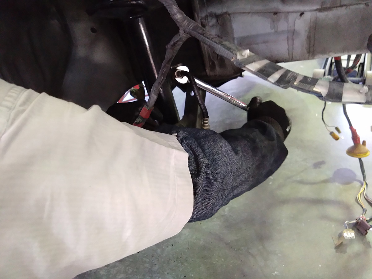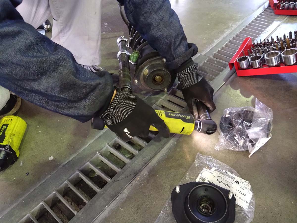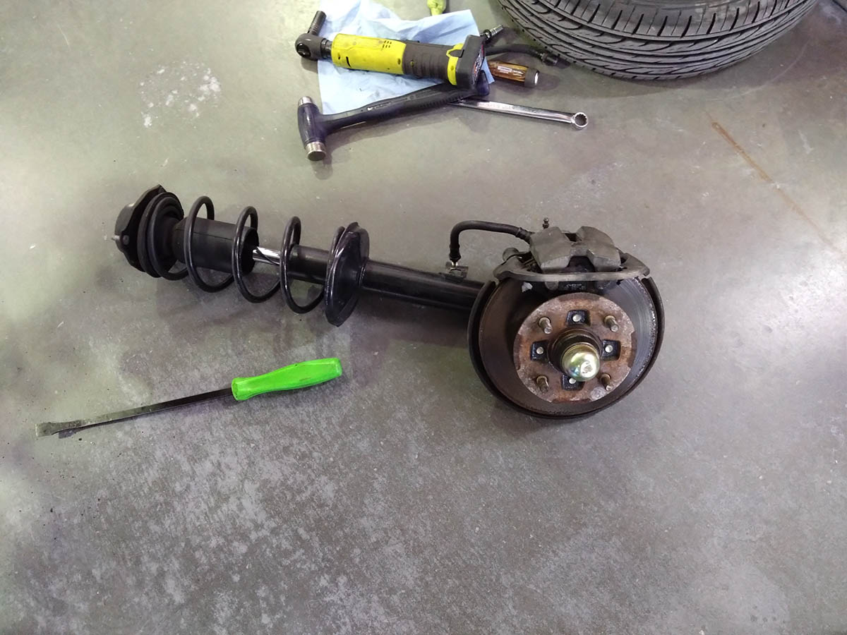 ロアアームとストラットの止めているボルトを外し、ストラットを切り離していきます。
