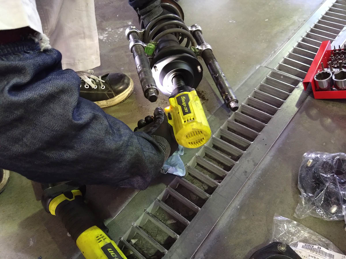 アッパーマウントをストラットにしっかりと取り付けたら、スプリングが飛び出すことはありませんのでスプリングコンプレッサーを外し