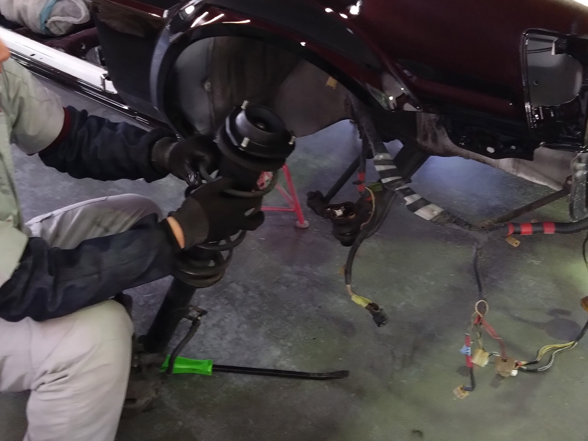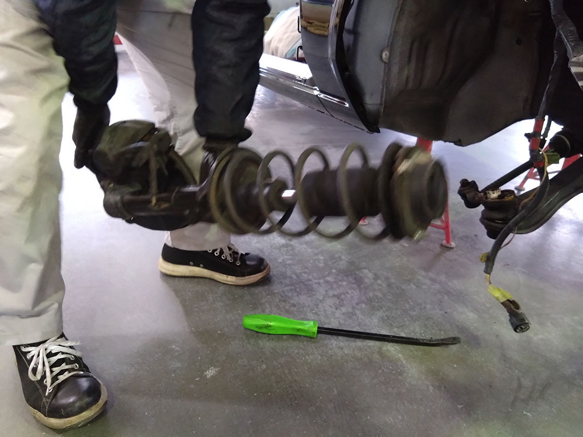ストラットが完全に車体から外れますので、下から引っこ抜きます。