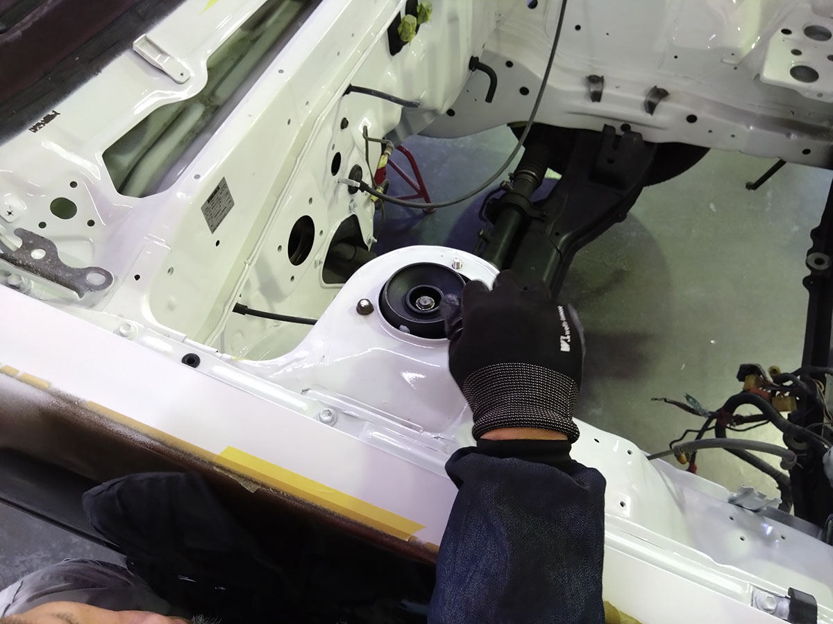 外れましたらストラット上部が止まっているアッパーマウントのナットをストラットタワーから外せば