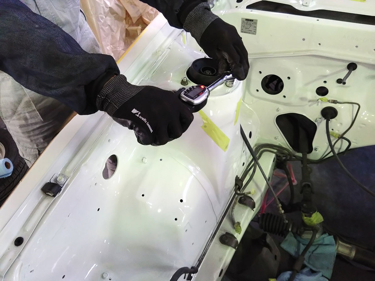 今回は、エンジンを載せる前の何もないエンジンルームの状態のタイミングで、先にフロントのアッパーマウントとブレーキホースを新品に交換します。走行距離的には交換しなくても大丈夫ではあるのですが、せっかくなので交換しておこうということになりました。
