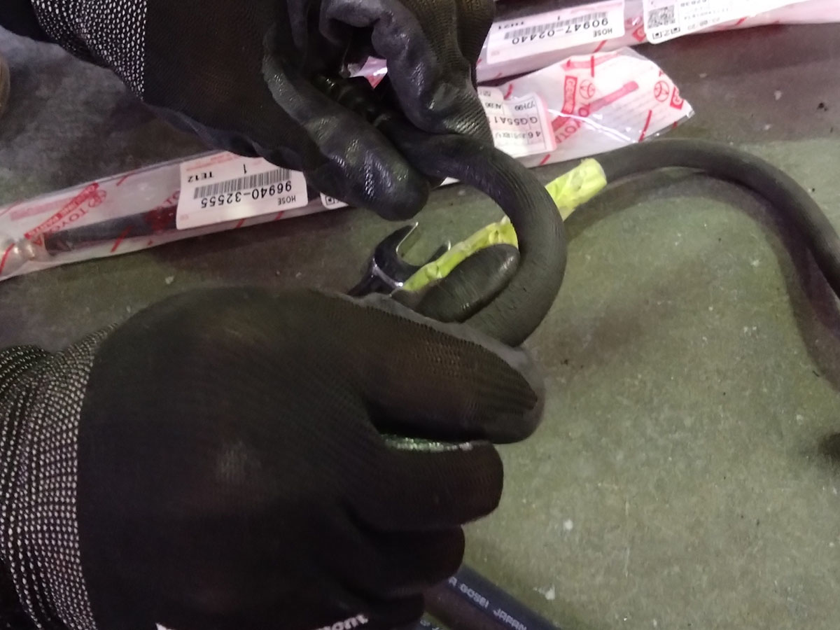 前後新しいブレーキホースを取り付け、接続部のピンをはめ締めれば交換完了です。