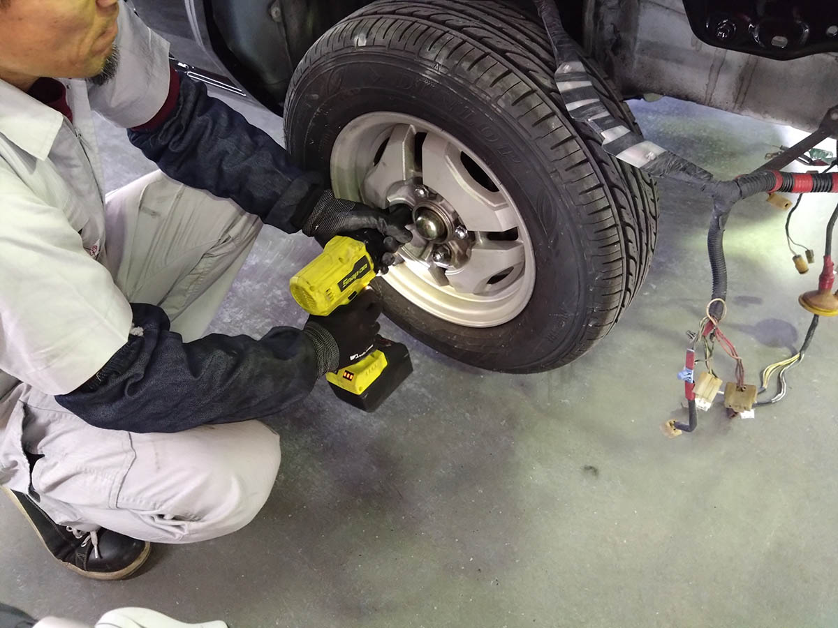 アッパーマウントとブレーキホースの交換ができましたので、移動できるようにホイールを再び取り付けて