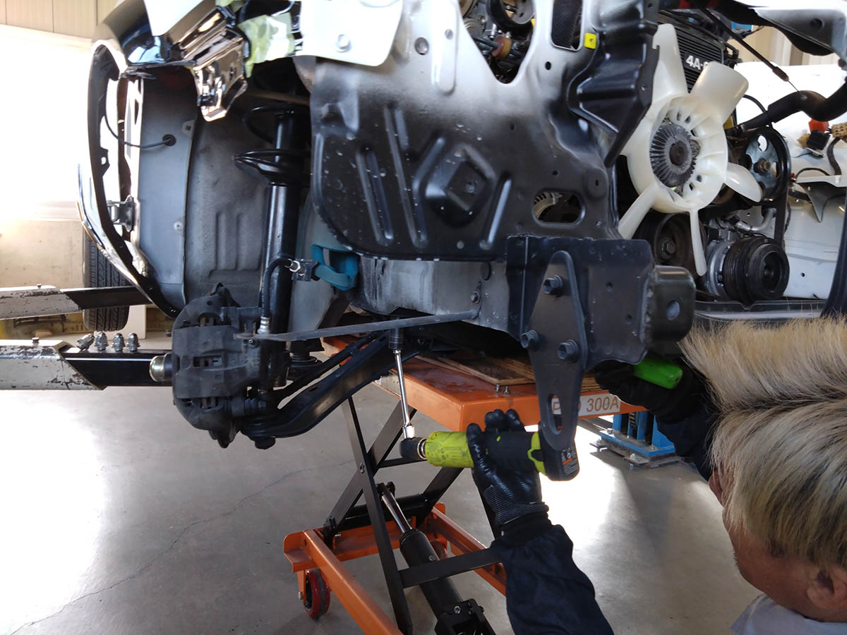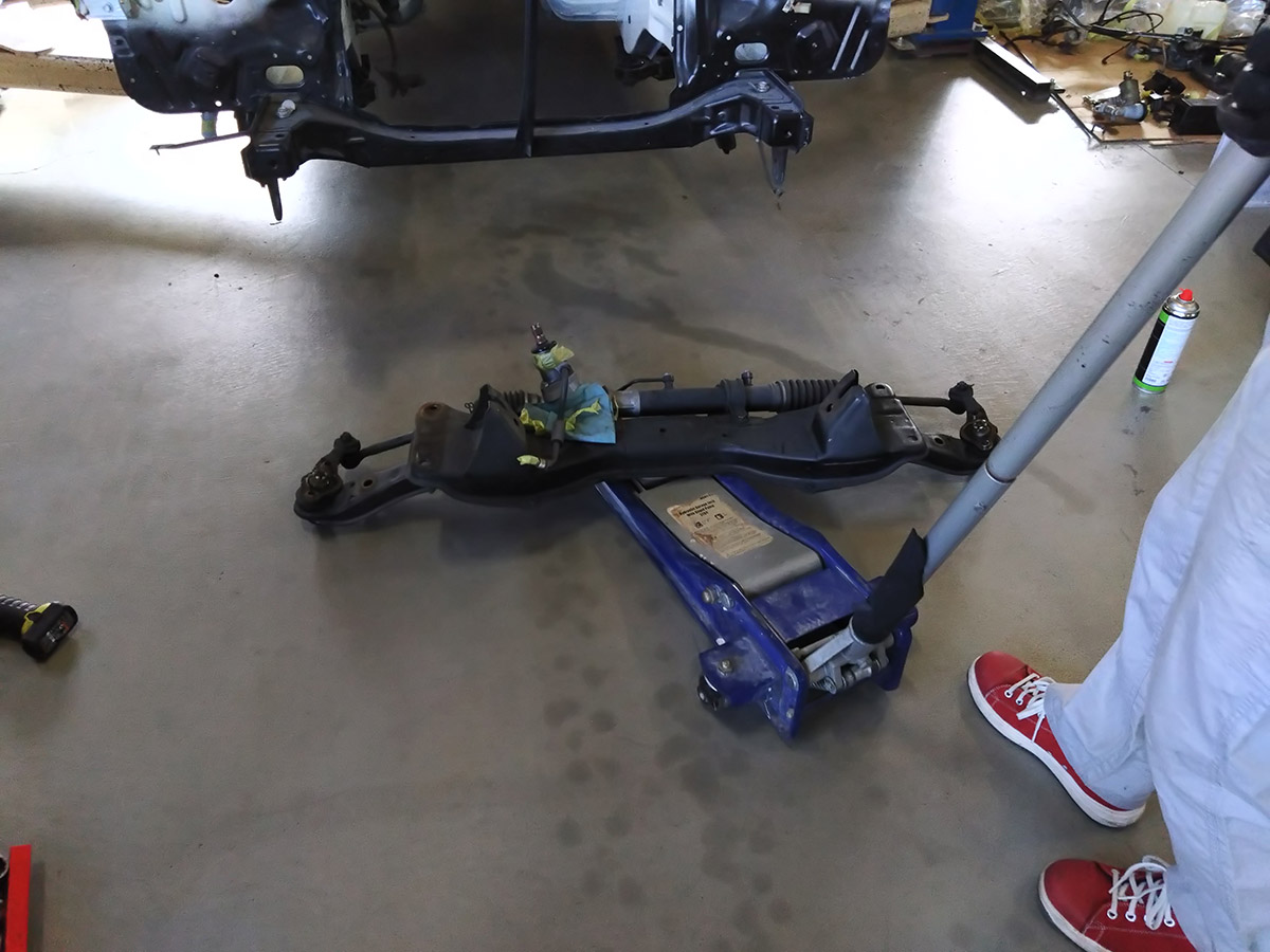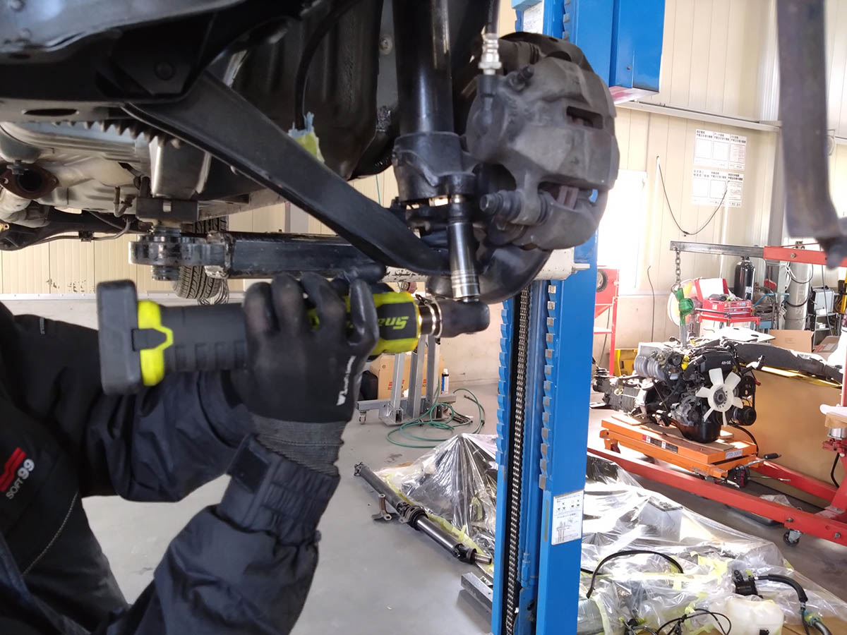 ブレーキの配管が完了しましたら、エンジンを搭載していくのですが、今回も前回同様、下から入れていくため、エンジンメンバーを外していきます。