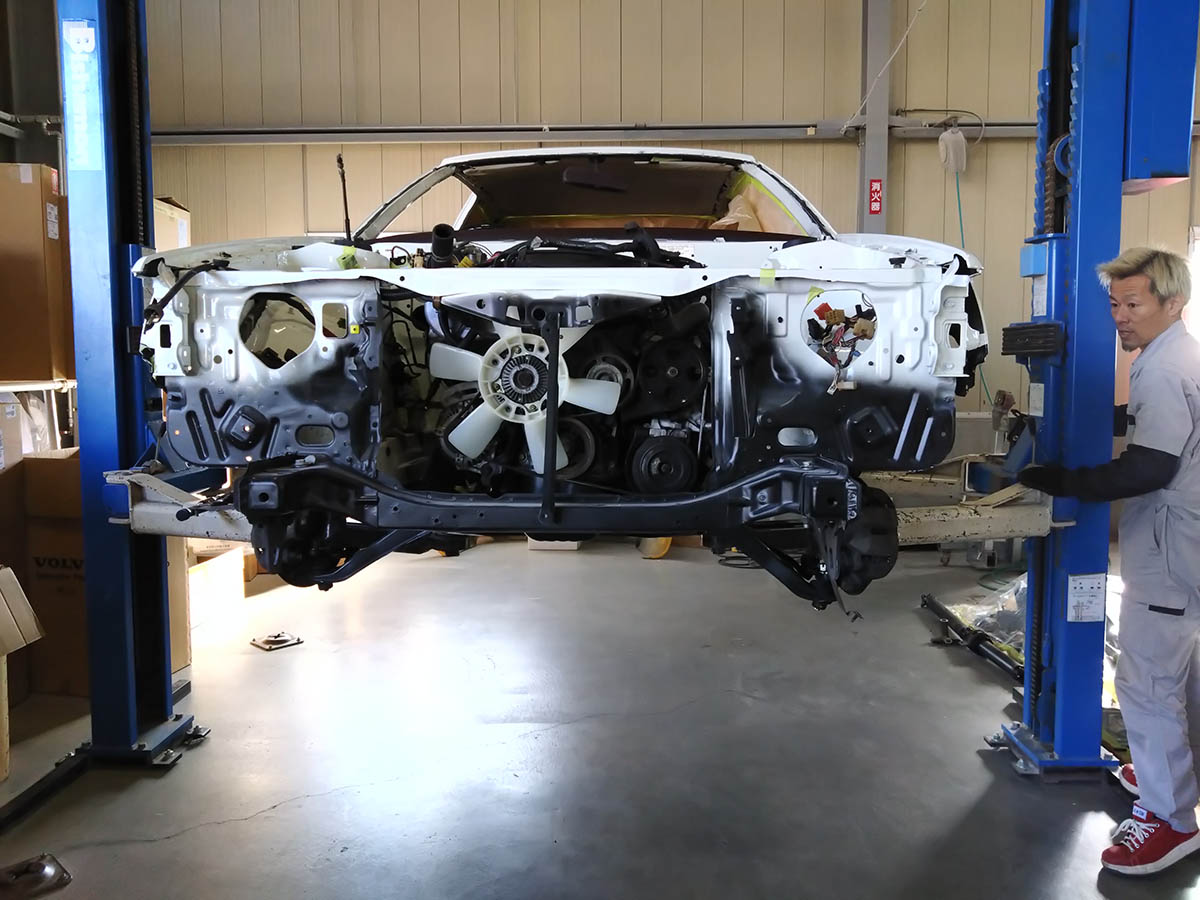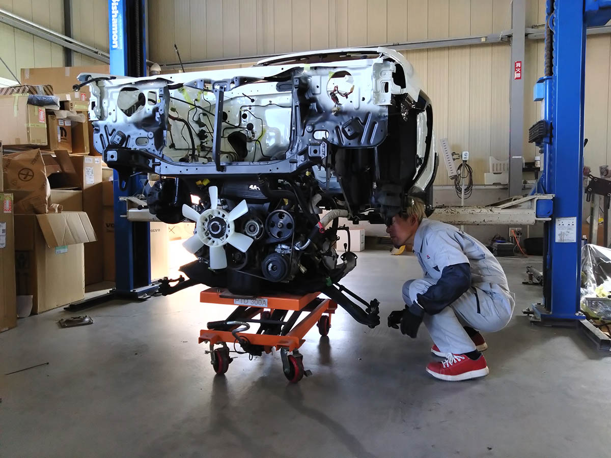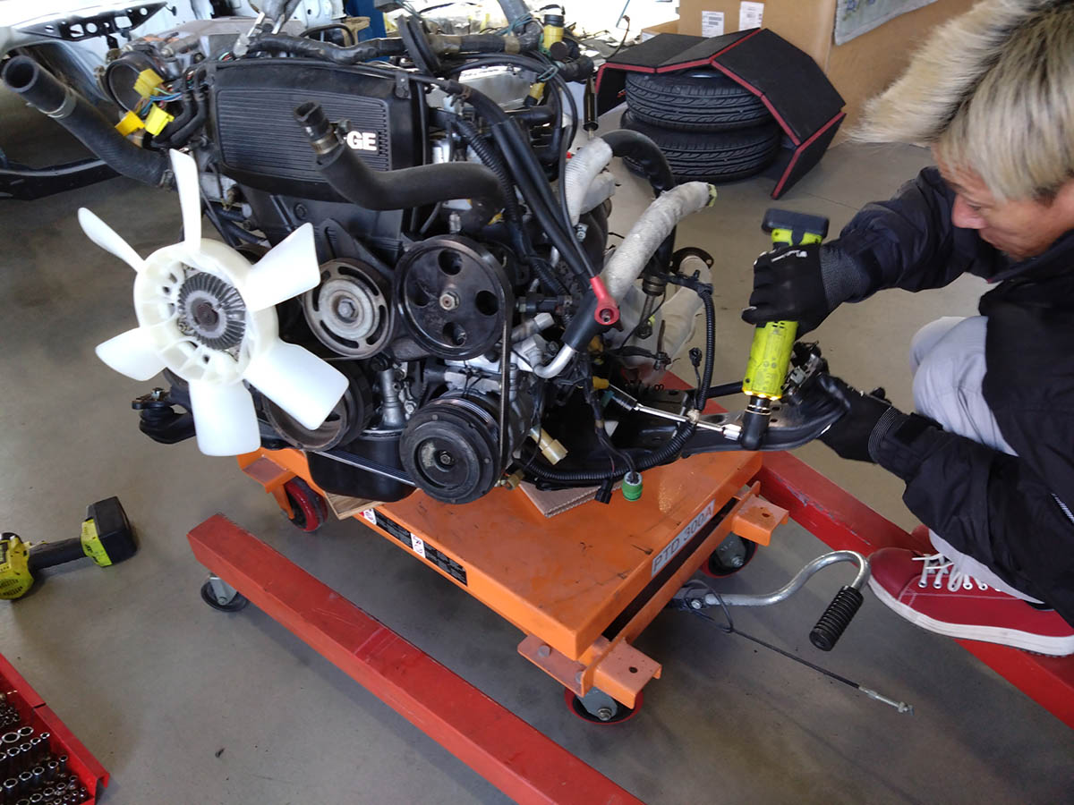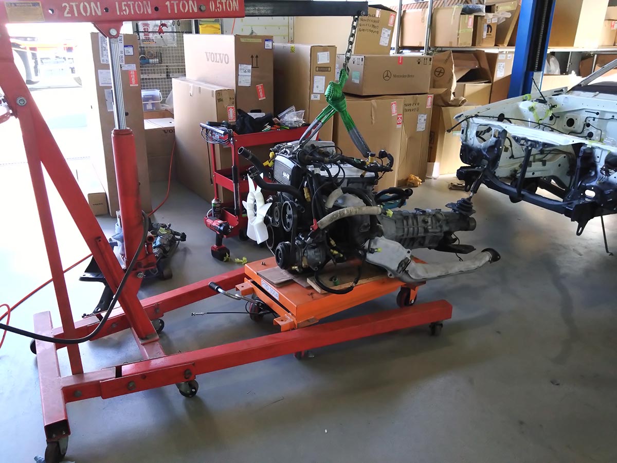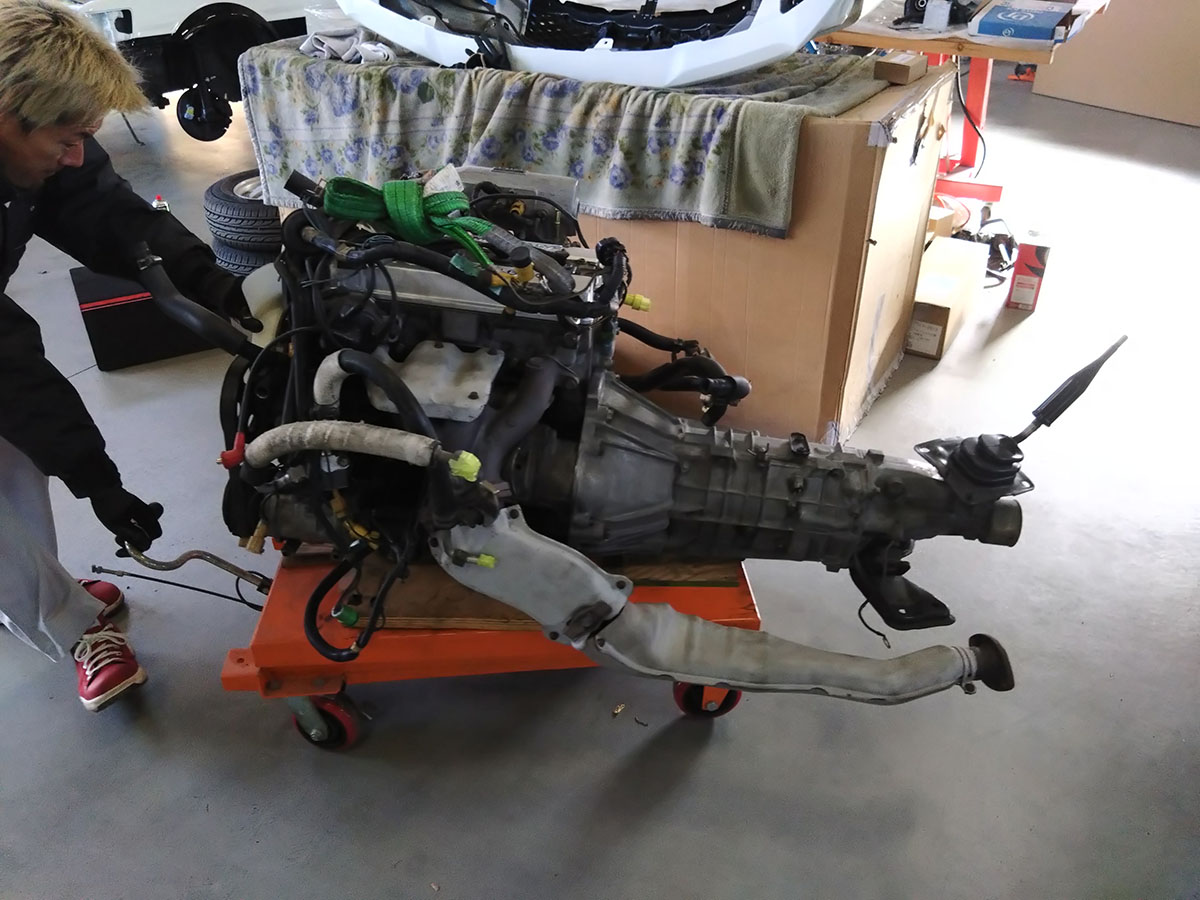 エンジンメンバーの取り付けが終わりましたら、いよいよエンジンルームにエンジンを載せていきます。