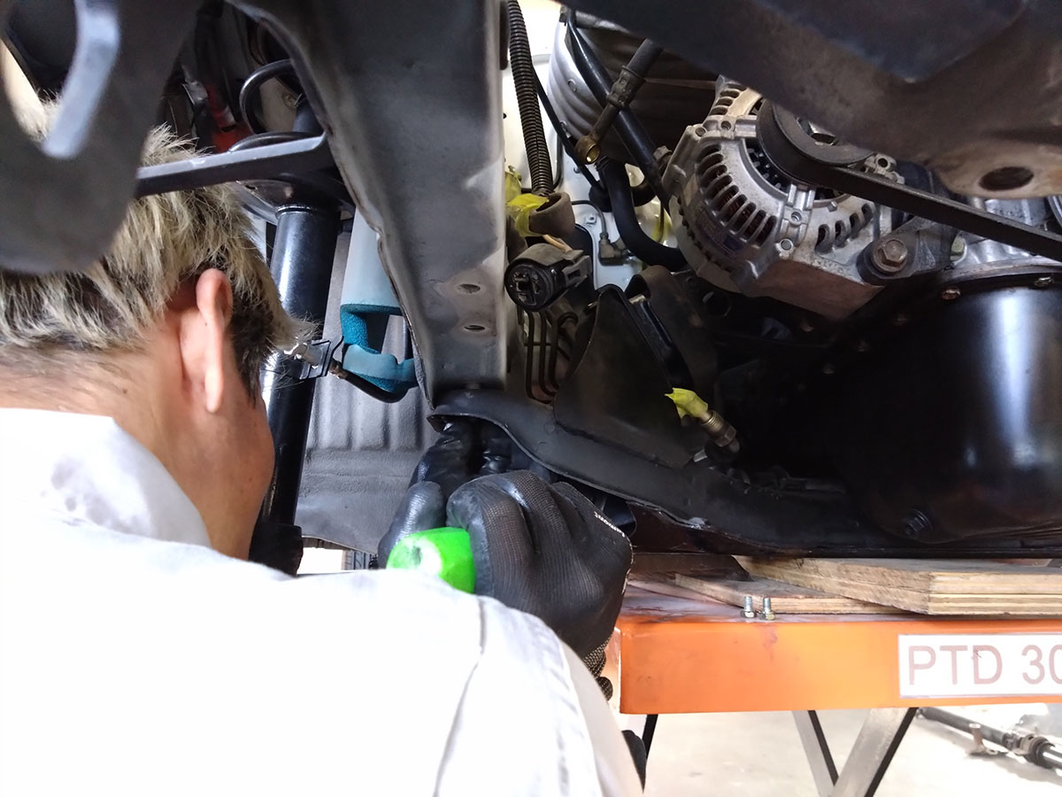 浮かしたエンジンの下からエンジンメンバーを取り付けていきます。