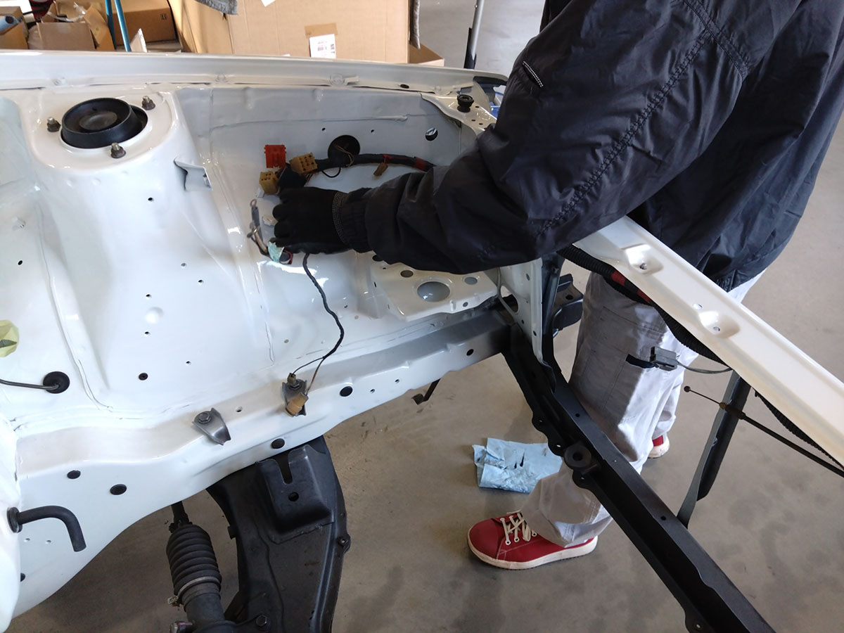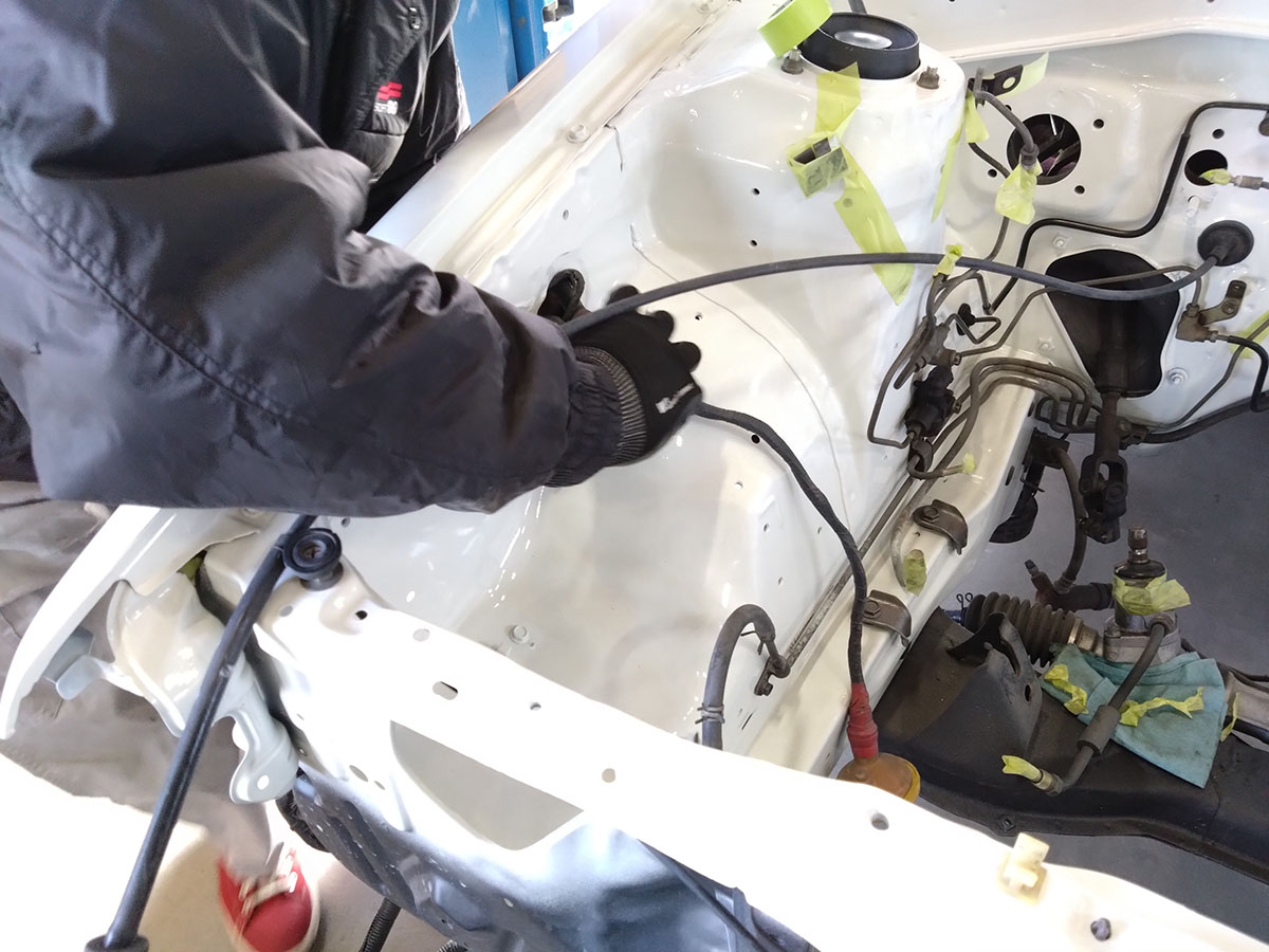 このタイミングで、タイヤハウスを通して社内にもつながっている配線を先に引き込んで元の位置にしておくことにしました。