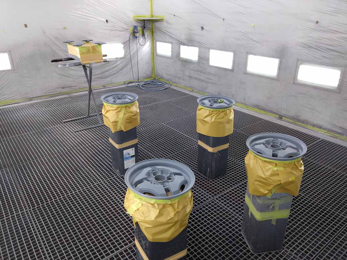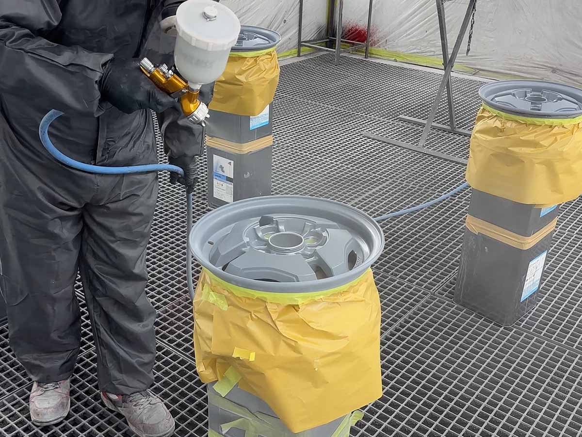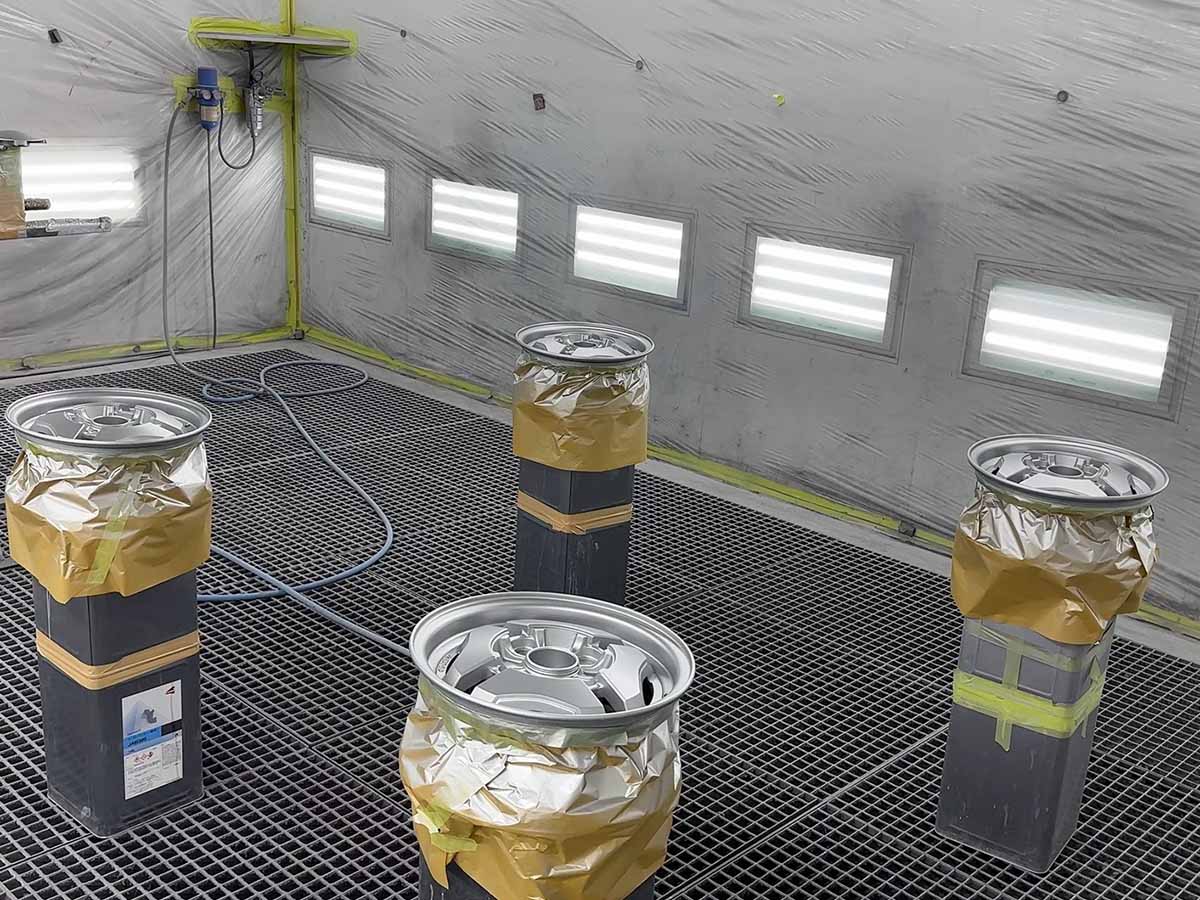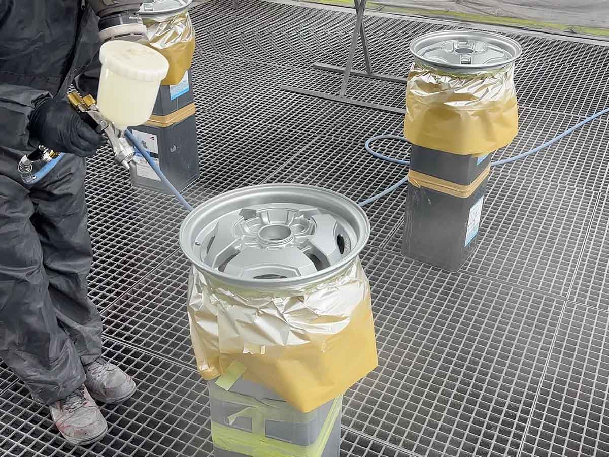 下地処理が完了しているホイールを塗装ブースに入れ、一斗缶の上に並べてマスキング・固定していきます。