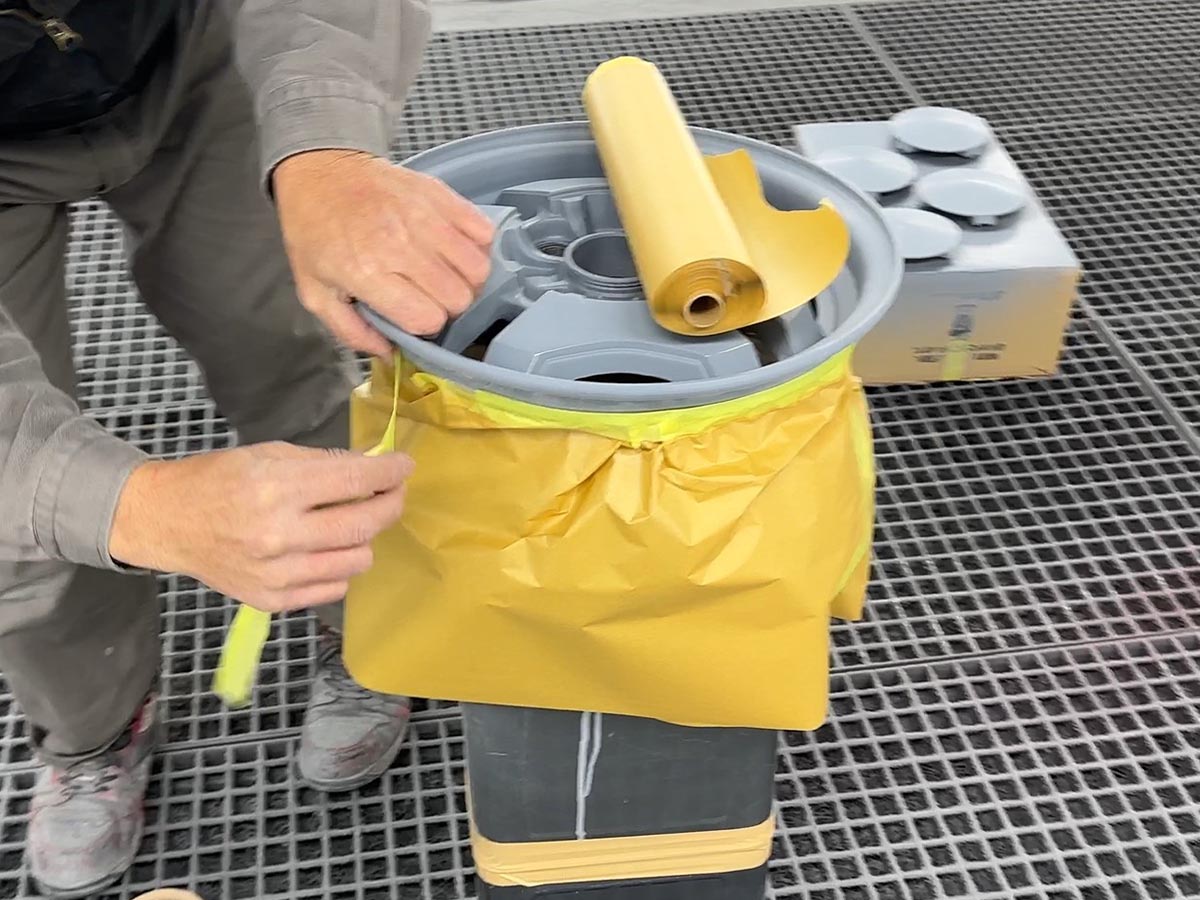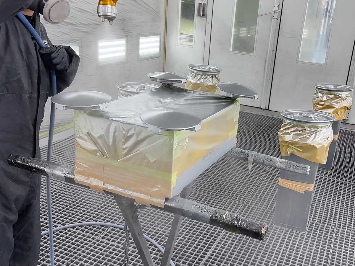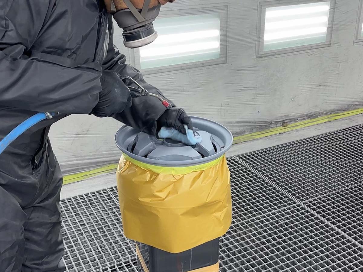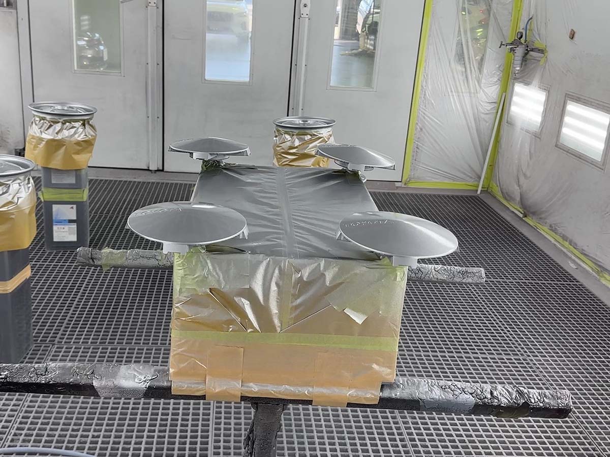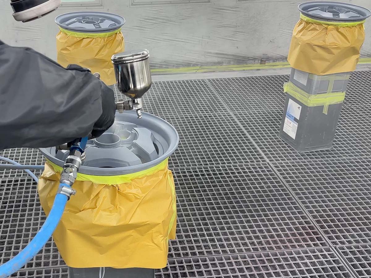 下地処理が完了しているホイールを塗装ブースに入れ、一斗缶の上に並べてマスキング・固定していきます。