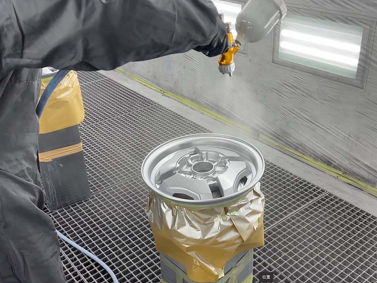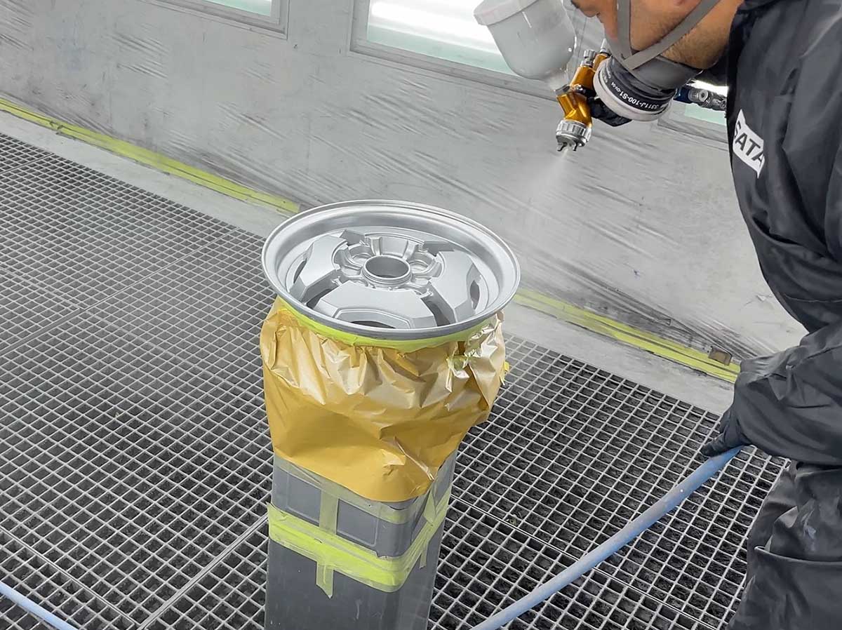 360度均一に塗料が乗っていくように、1本のホイールを4方向から塗装していきます。