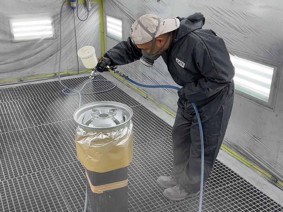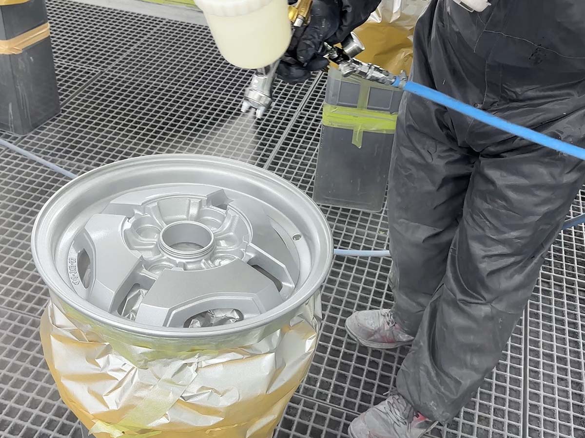 ホイールの塗装は走行での振動が常に加わることで塗料の割れや剥がれが起きやすい箇所ですので、プライマーをすることで、塗料との密着性を高めるために必要な作業です。吹き残しが無いよう、奥まった部分も含めしっかりとスプレーしていきます。